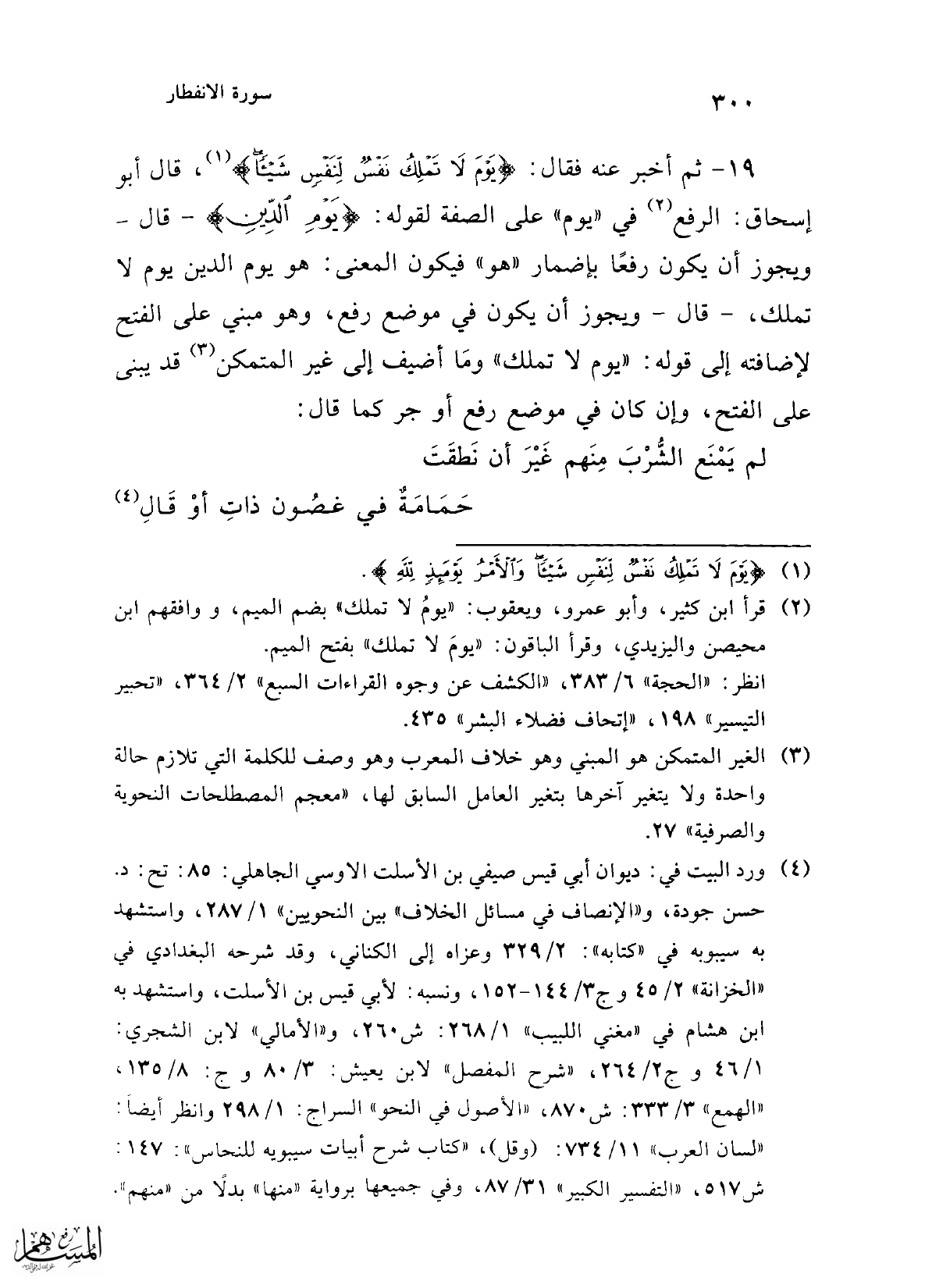19 - ثم أخبر عنه فقال: {يَوْمَ لَا تَمْلِكُ نَفْسٌ لِنَفْسٍ شَيْئًا} (¬1)، قال أبو إسحاق: الرفع (¬2) في "يوم" على الصفة لقوله: {يَوْمُ الدِّينِ} -قال- ويجوز أن يكون رفعًا بإضمار "هو" فيكون المعنى: هو يوم الدين يوم لا تملك، -قال- ويجوز أن يكون في موضع رفع، وهو مبني على الفتح لإضافته إلى قوله: "يوم لا تملك" ومَا أضيف إلى غير المتمكن (¬3) قد يبنى على الفتح، وإن كان في موضع رفع أو جر كما قال:
