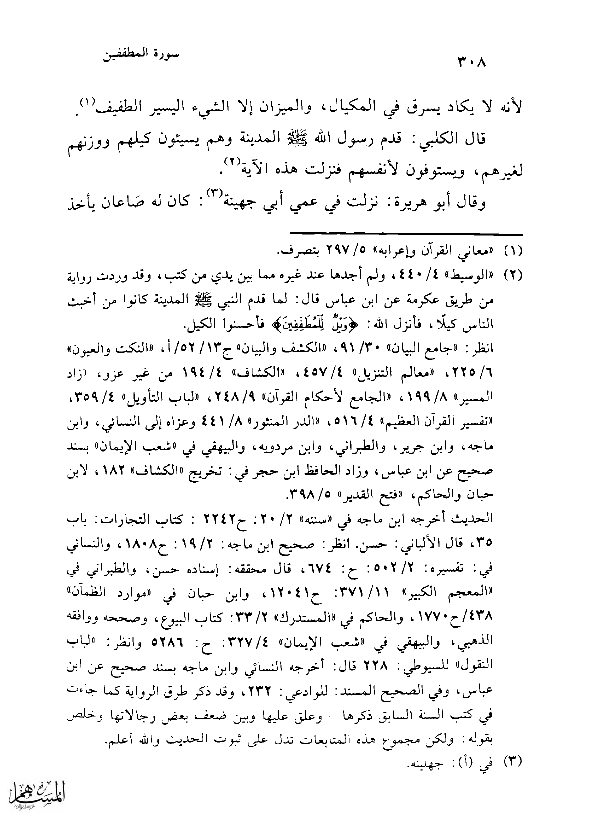 (¬2) "الوسيط" 4/ 440، ولم أجدها عند غيره مما بين يدي من كتب، وقد وردت رواية من طريق عكرمة عن ابن عباس قال: لما قدم النبي -صلى الله عليه وسلم- المدينة كانوا من أخبث الناس كيلًا، فأنزل الله: {وَيْلٌ لِلْمُطَفِّفِينَ} فأحسنوا الكيل.