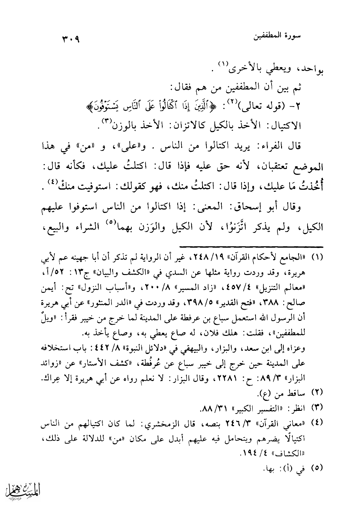 (¬4) "معاني القرآن" 3/ 246 بنصه، قال الزمخشري: لما كان اكتيالهم من الناس اكتيالًا يضرهم ويتحامل فيه عليهم أبدل على مكان "من" للدلالة على ذلك، "الكشاف" 4/ 194.