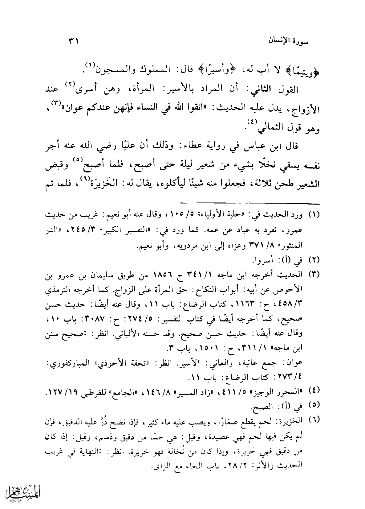 القول الثاني: أن المراد بالأسير: المرأة، وهن أسرى (¬2) عند الأزواج، يدل عليه الحديث: "اتقوا الله في النساء فإنهن عندكم عوان" (¬3)، وهو قول الثمالي (¬4).