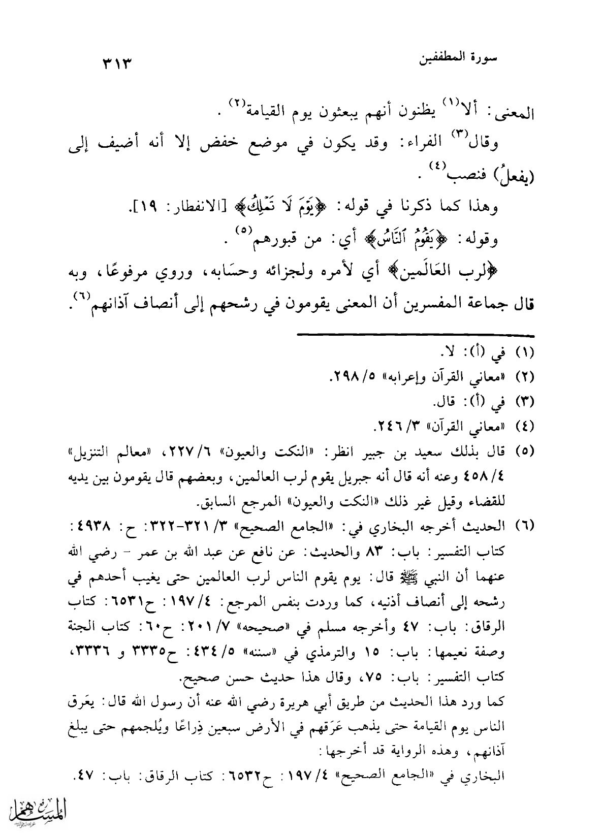 (¬6) الحديث أخرجه البخاري في: "الجامع الصحيح" 3/ 321 - 322: ح: 4938: كتاب التفسير: باب: 83 والحديث: عن نافع عن عبد الله بن عمر - رضي الله عنهما أن النبي -صلى الله عليه وسلم- قال: يوم يقوم الناس لرب العالمين حتى يغيب أحدهم في رشحه إلى أنصاف أذنيه، كما وردت بنفس المرجع: 4/ 197: ح 6531: كتاب الرقاق: باب: 47 وأخرجه مسلم في "صحيحه" 7/ 201: ح 60: كتاب الجنة وصفة نعيمها: باب: 15 والترمذي في "سننه" 5/ 434: ح 3335 و3336، كتاب التفسير: باب: 75، وقال هذا حديث حسن صحيح.