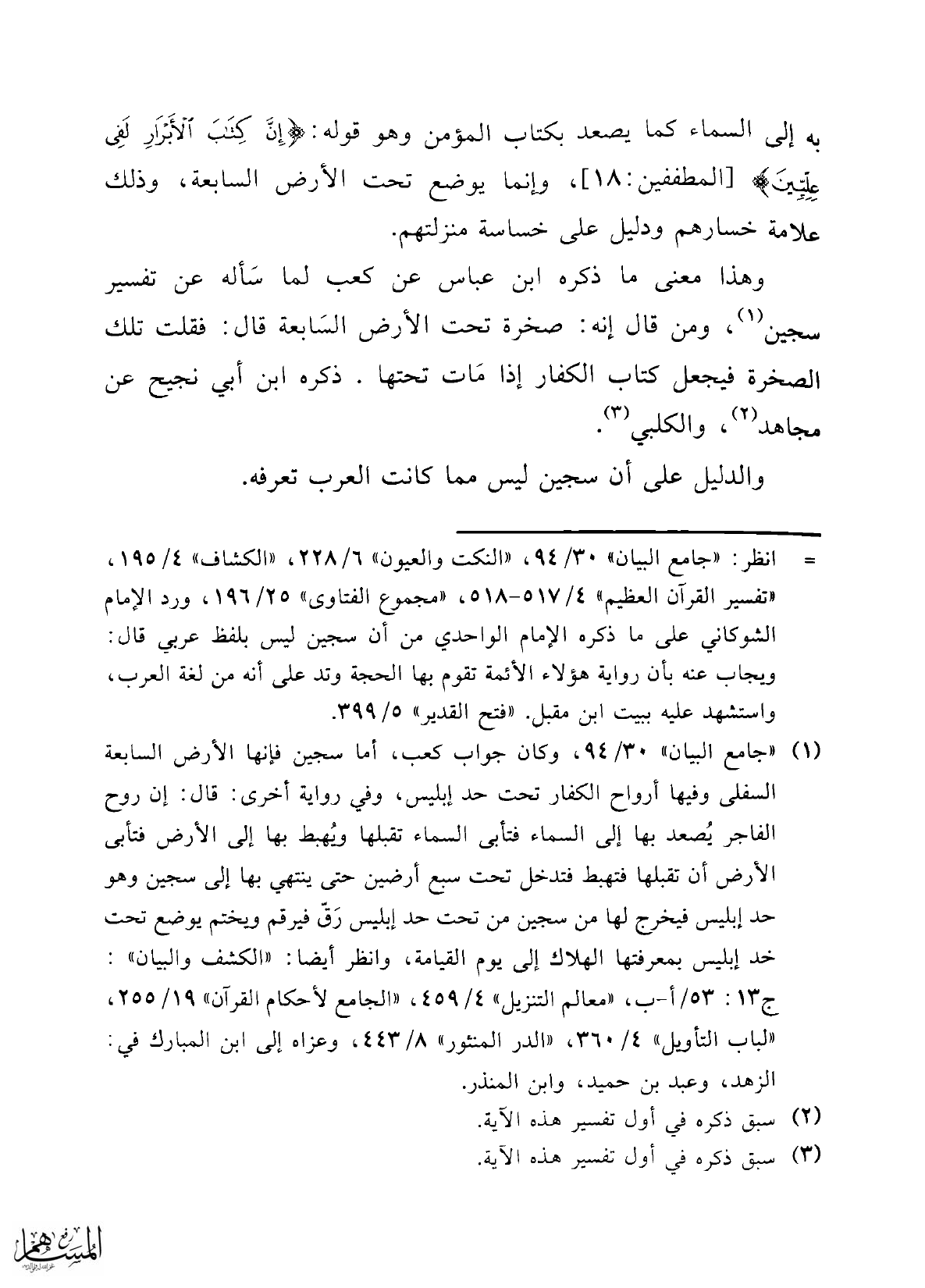 (¬1) "جامع البيان" 30/ 94، وكان جواب كعب، أما سجين فإنها الأرض السابعة السفلى وفيها أرواح الكفار تحت حد إبليس، وفي رواية أخرى: قال: إن روح الفاجر يُصعد بها إلى السماء فتأبى السماء تقبلها وُيهبط بها إلى الأرض فتأبى الأرض أن تقبلها فتهبط فتدخل تحت سبع أرضين حتى ينتهي بها إلى سجين وهو حد إبليس فيخرج لها من سجين من تحت حد إبليس رَقّ فيرقم ويختم يوضع تحت خد إبليس بمعرفتها الهلاك إلى يوم القيامة، وانظر أيضا: "الكشف والبيان": ج 13: 53/ أ - ب، "معالم التنزيل" 4/ 459، "الجامع لأحكام القرآن" 19/ 255، "لباب التأويل" 4/ 360، "الدر المنثور" 8/ 443، وعزاه إلى ابن المبارك في: الزهد، وعبد بن حميد، وابن المنذر.