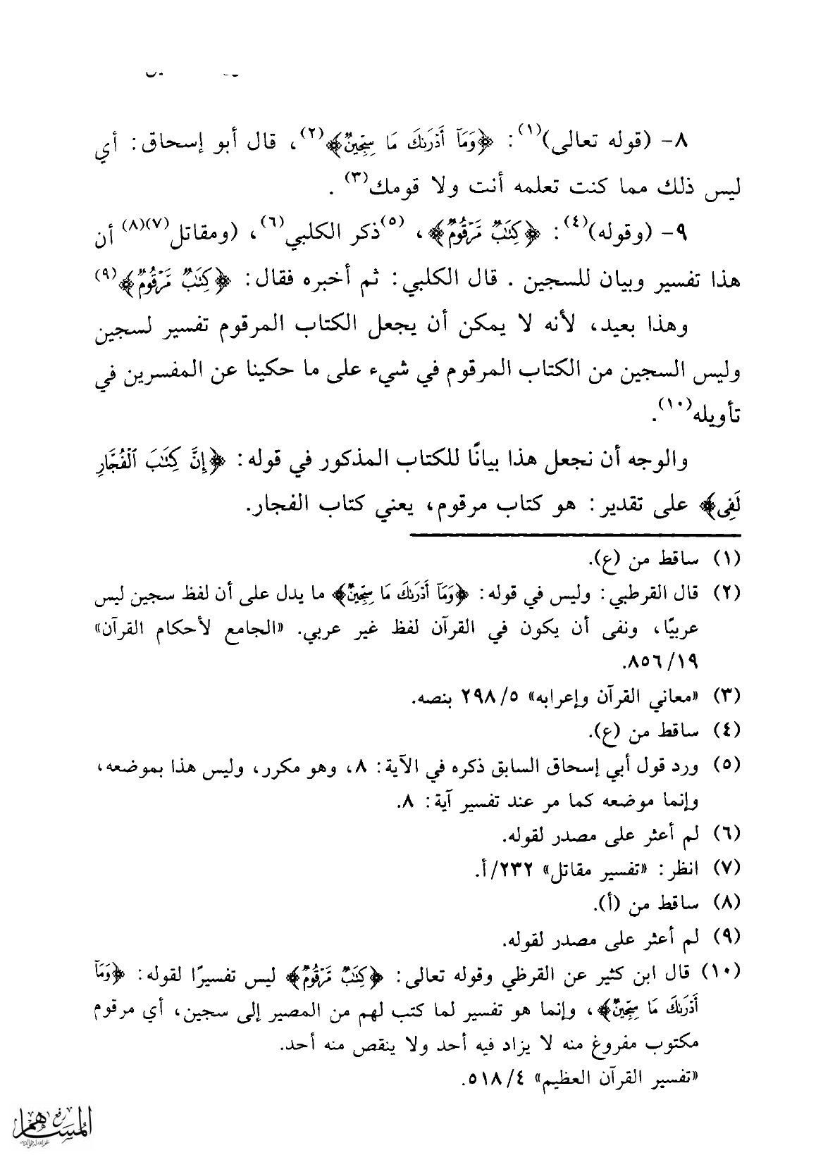 (¬10) قال ابن كثير عن القرظي وقوله تعالى: {كِتَابٌ مَرْقُومٌ} ليس تفسيرًا لقوله: {وَمَا أَدْرَاكَ مَا سِجِّينٌ}، وإنما هو تفسير لما كتب لهم من المصير إلى سجين، أي مرقوم مكتوب مفروغ منه لا يزاد فيه أحد ولا ينقص منه أحد.
