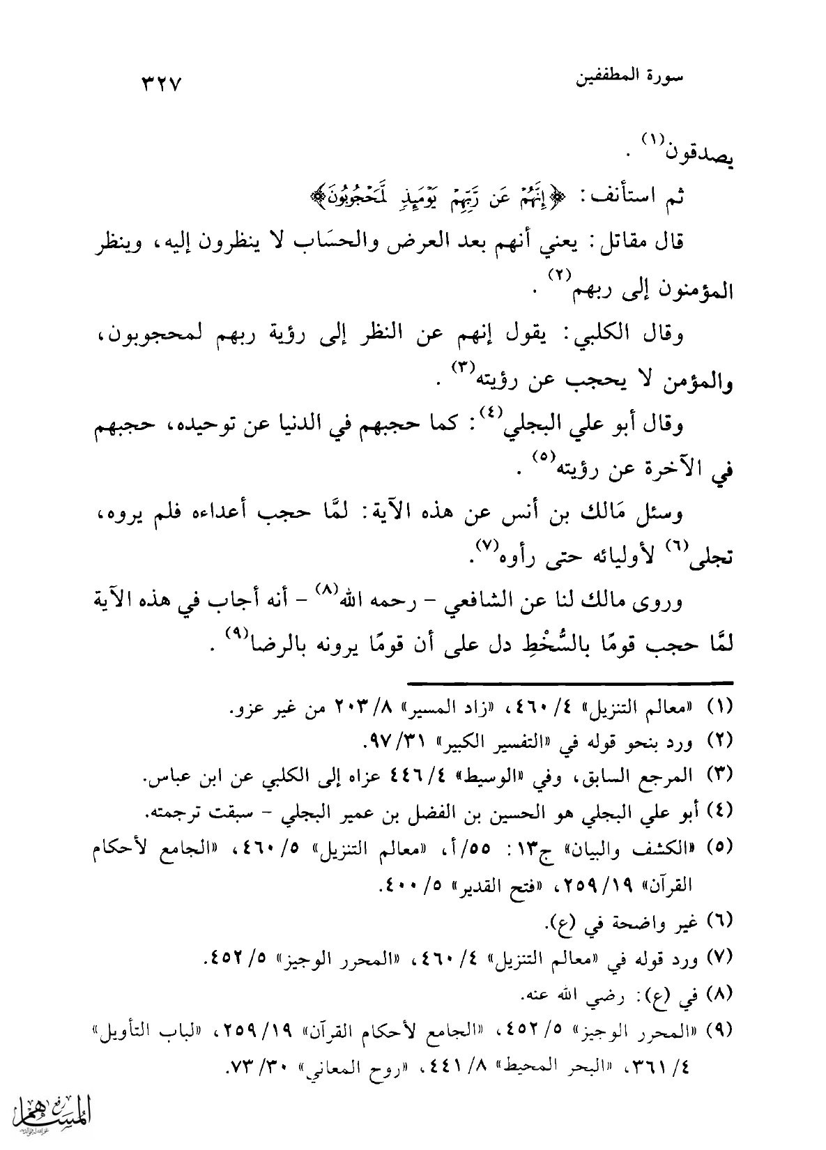 (¬9) "المحرر الوجيز" 5/ 452، "الجامع لأحكام القرآن" 19/ 259، "لباب التأويل" 4/ 361، "البحر المحيط" 8/ 441، "روح المعاني" 30/ 73.
