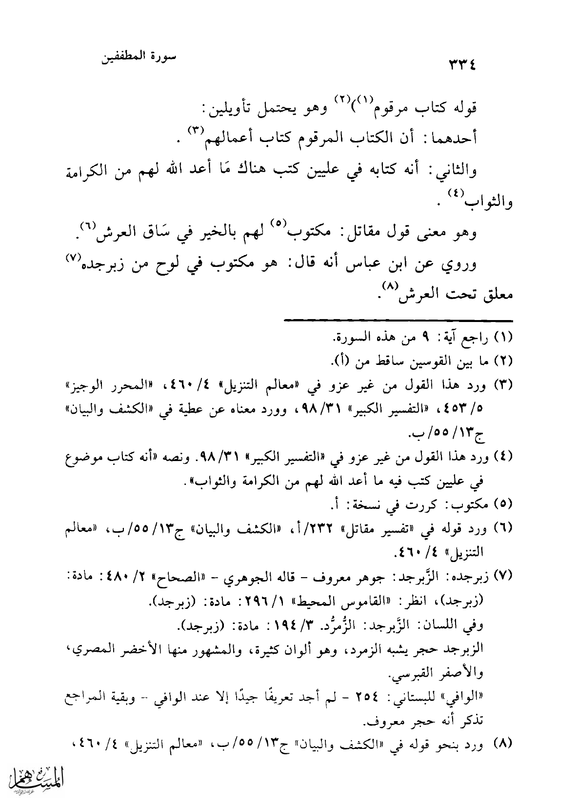 (¬4) ورد هذا القول من غير عزو في "التفسير الكبير" 31/ 98. ونصه "أنه كتاب موضوع في عليين كتب فيه ما أعد الله لهم من الكرامة والثواب".