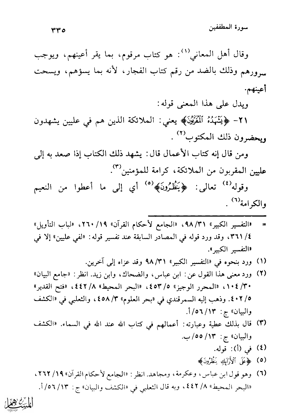 21 - {يَشْهَدُهُ الْمُقَرَّبُونَ} يعني: الملائكة الذين هم في عليين يشهدون ويحضرون ذلك المكتوب (¬2).