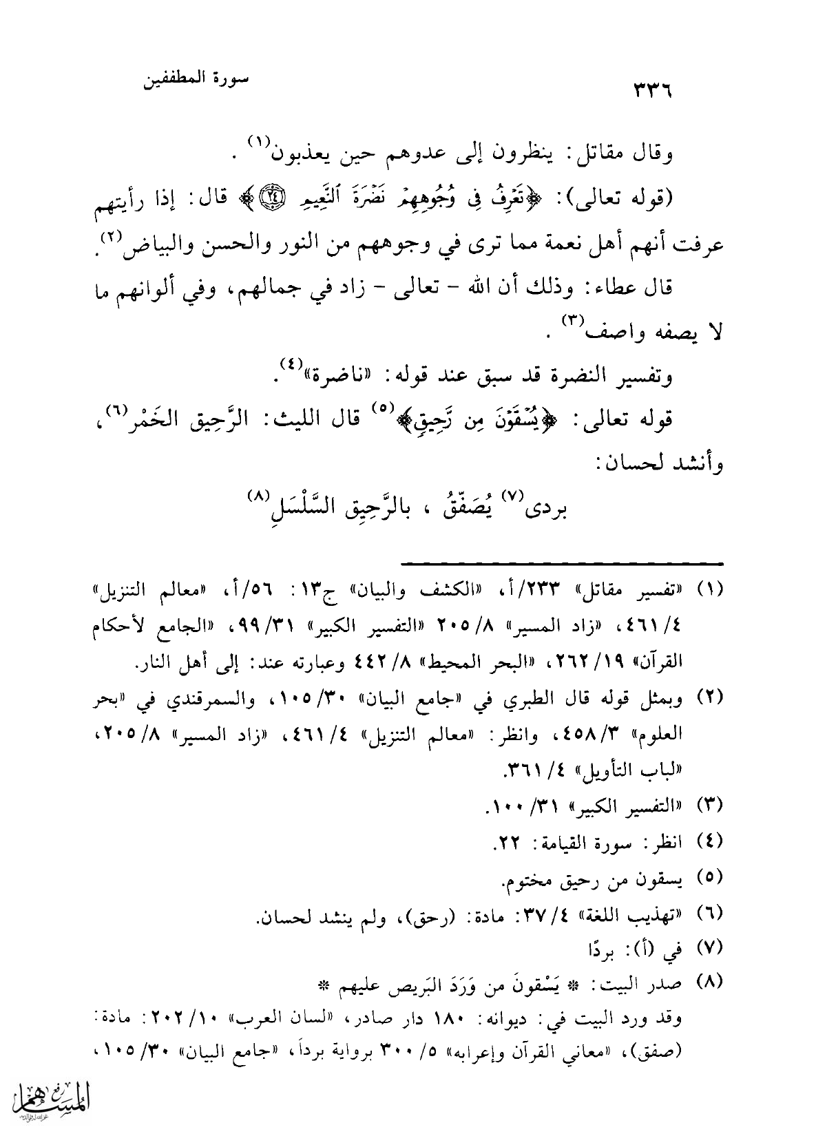 (قوله تعالى): {تَعْرِفُ فِي وُجُوهِهِمْ نَضْرَةَ النَّعِيمِ (24)} قال: إذا رأيتهم عرفت أنهم أهل نعمة مما ترى في وجوههم من النور والحسن والبياض (¬2).