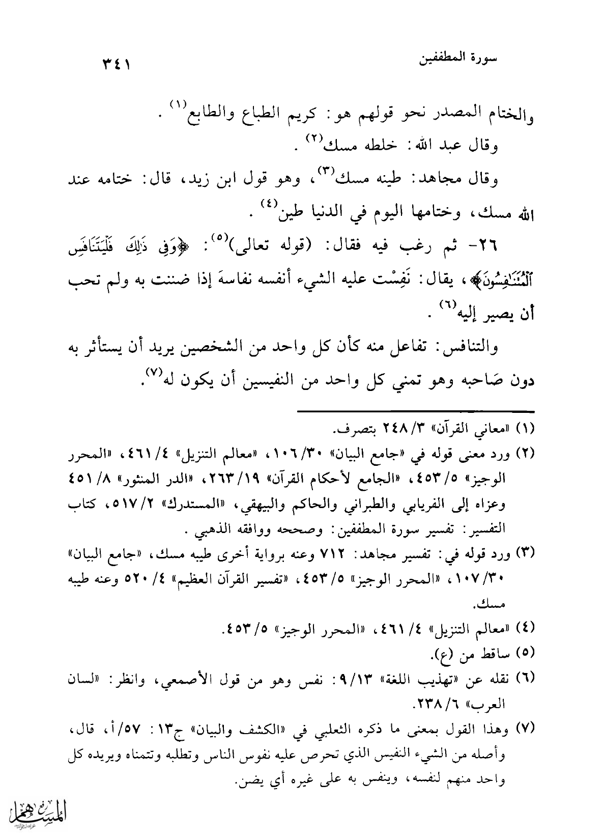 (¬3) ورد قوله في: تفسير مجاهد: 712 وعنه برواية أخرى طيبه مسك، "جامع البيان" 30/ 107، "المحرر الوجيز" 5/ 453، "تفسير القرآن العظيم" 4/ 520 وعنه طيبه مسك.