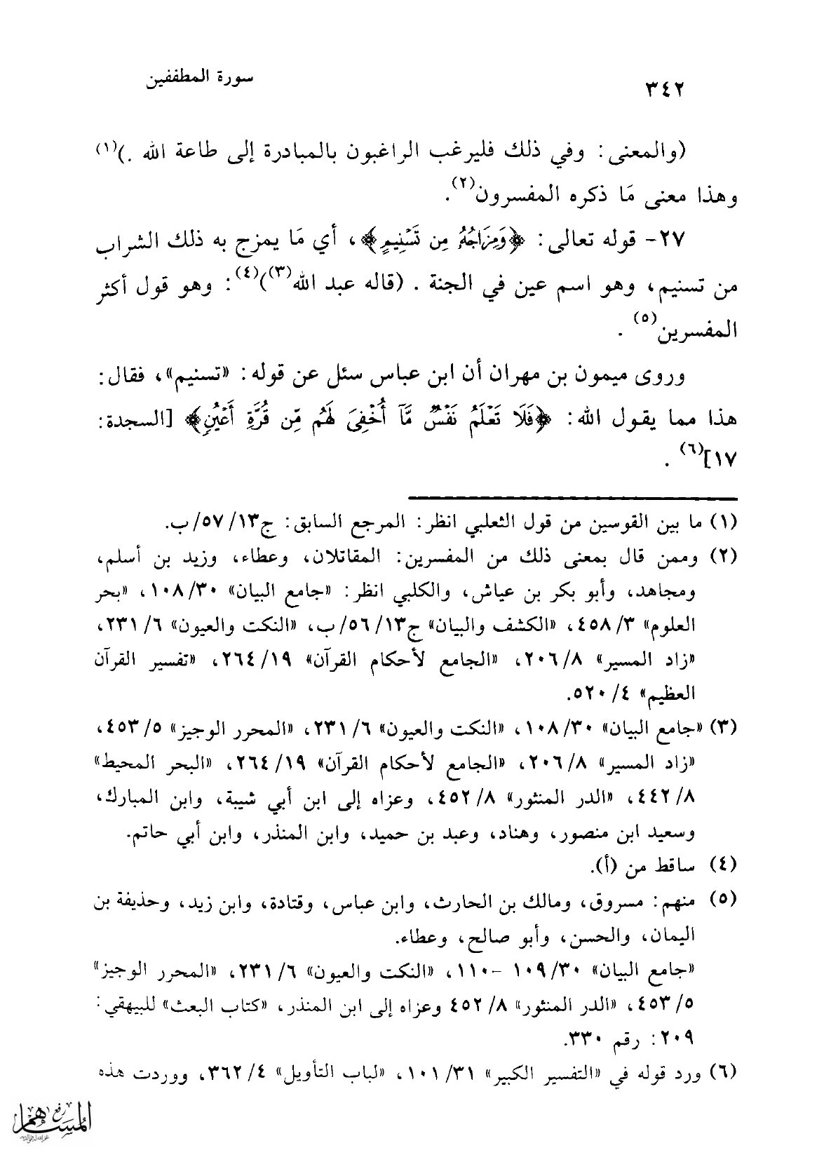 وروى ميمون بن مهران أن ابن عباس سئل عن قوله: "تسنيم"، فقال: هذا مما يقول الله: {فَلَا تَعْلَمُ نَفْسٌ مَا أُخْفِيَ لَهُمْ مِنْ قُرَّةِ أَعْيُنٍ} [السجدة: 17] (¬6).