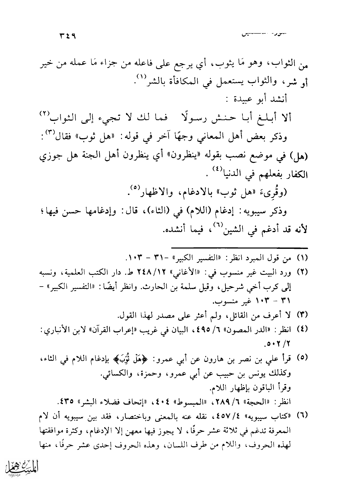 (¬5) قرأ علي بن نصر بن هارون عن أبي عمرو: {هَلْ ثُوِّبَ} بإدغام اللام في الثاء، وكذلك يونس بن حبيب عن أبي عمرو، وحمزة، والكسائي. وقرأ الباقون بإظهار اللام.