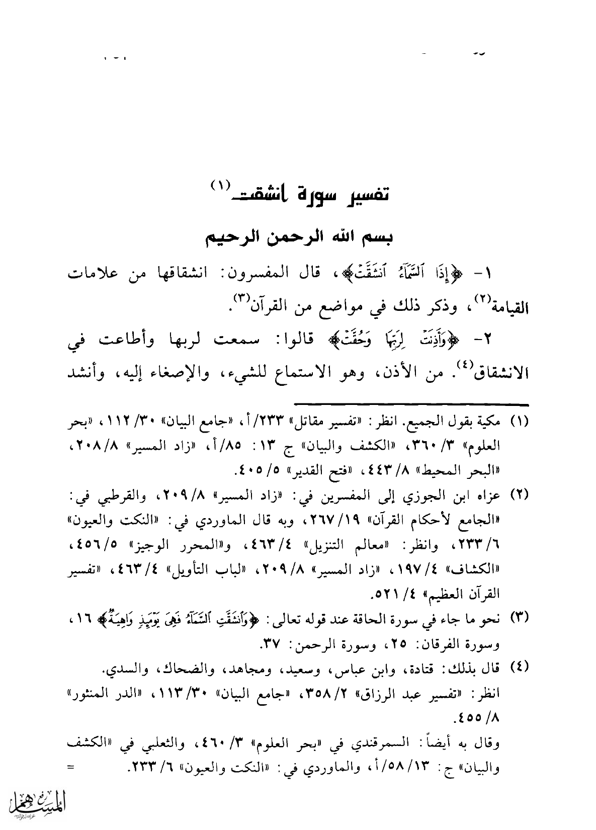 1 - {إِذَا السَّمَاءُ انْشَقَّتْ}، قال المفسرون: انشقاقها من علامات القيامة (¬2)، وذكر ذلك في مواضع من القرآن (¬3).