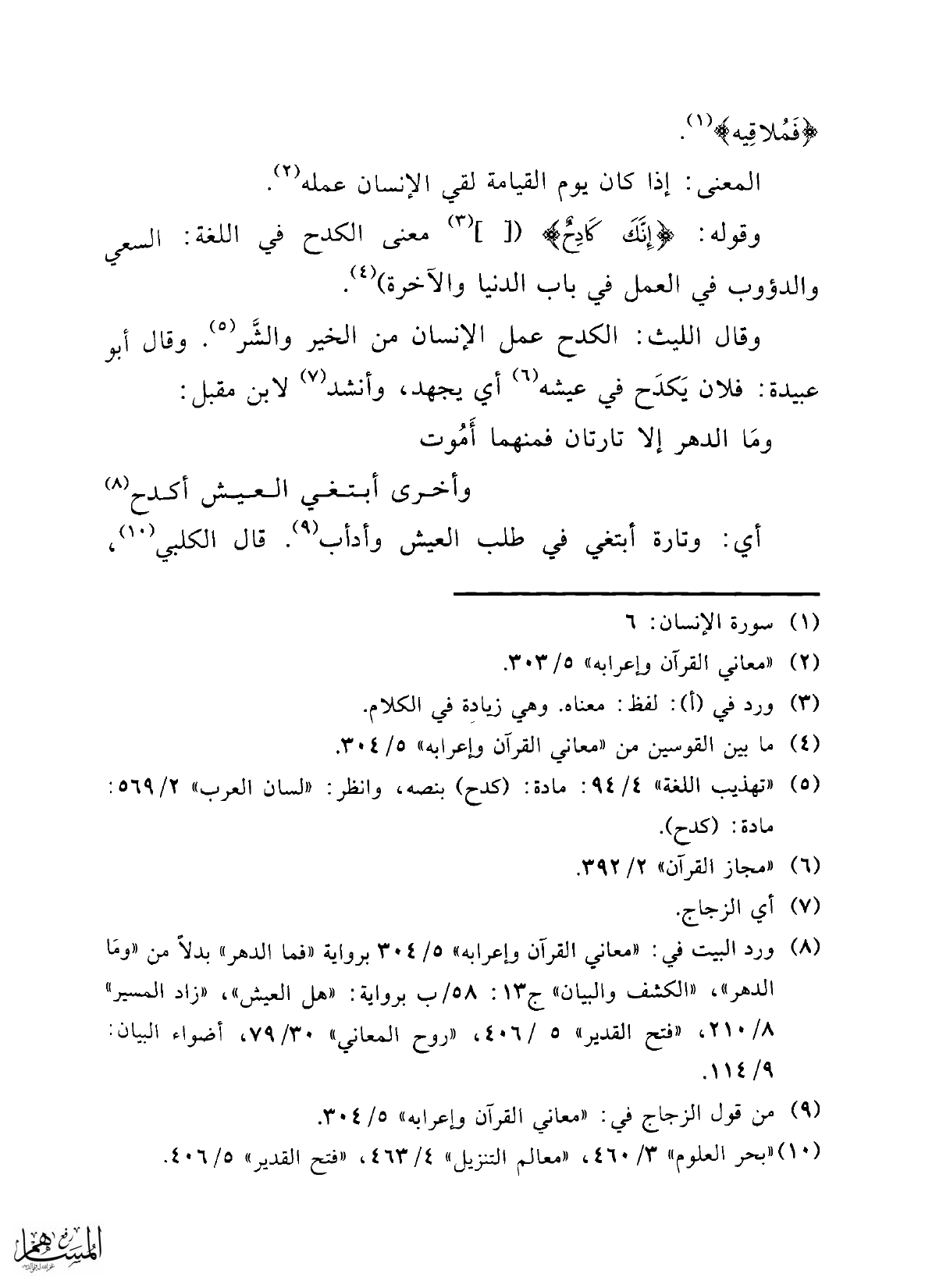 وقوله: {إِنَّكَ كَادِحٌ} ([..] (¬3) معنى الكدح في اللغة: السعي والدؤوب في العمل في باب الدنيا والآخرة) (¬4).