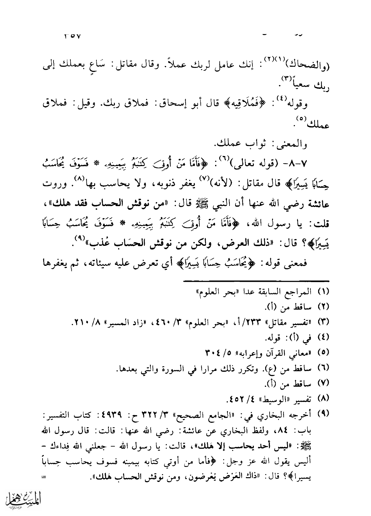 7، 8 - (قوله تعالى) (6): {فَأَمَّا مَنْ أُوتِيَ كِتَابَهُ بِيَمِينِهِ (7) فَسَوْفَ يُحَاسَبُ حِسَابًا يَسِيرًا (8)} قال مقاتل: (لأنه) (7) يغفر ذنوبه، ولا يحاسب بها (8). وروت عائشة -رضي الله عنها- أن النبي -صلى الله عليه وسلم- قال: "من نوقش الحساب فقد هلك"، قلت: يا رسول الله، {فَأَمَّا مَنْ أُوتِيَ كِتَابَهُ بِيَمِينِهِ (7) فَسَوْفَ يُحَاسَبُ حِسَابًا يَسِيرًا (8)}؟ قال: "ذلك العرض، ولكن من نوقش الحسَاب عُذب" (9).