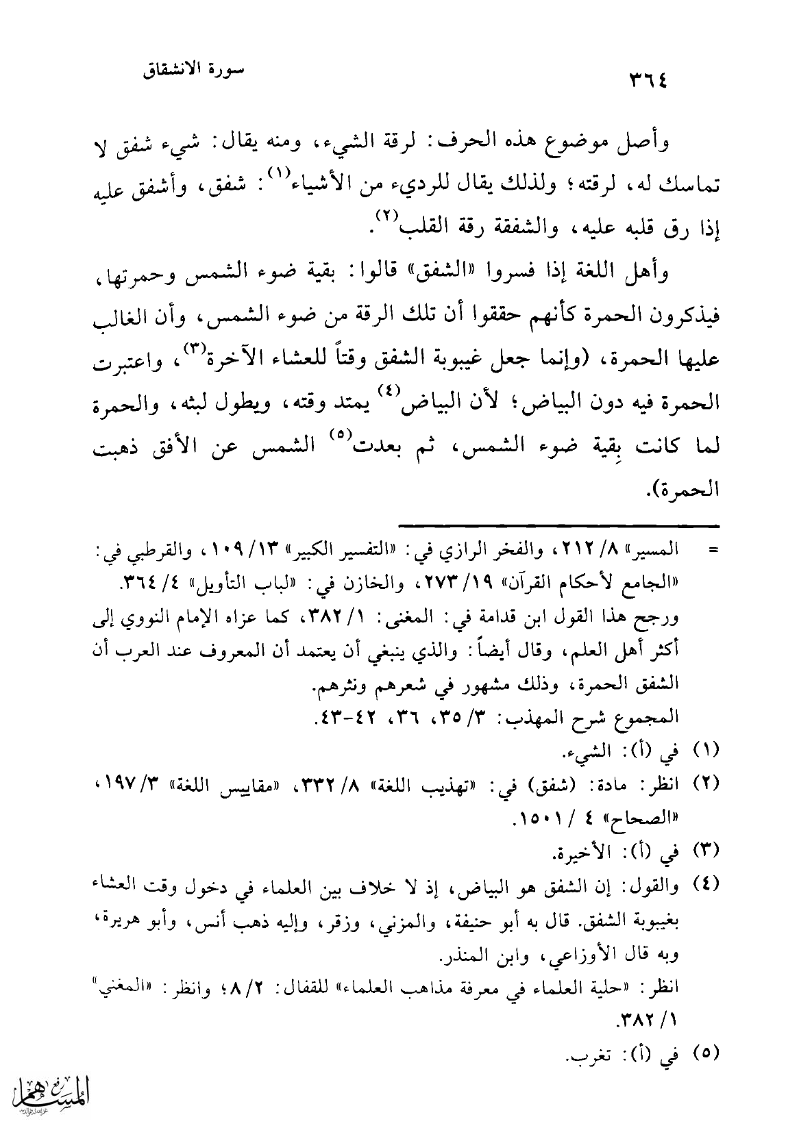 (¬2) انظر: مادة: (شفق) في: "تهذيب اللغة" 8/ 332، "مقاييس اللغة" 3/ 197, "الصحاح" 4/ 1501.