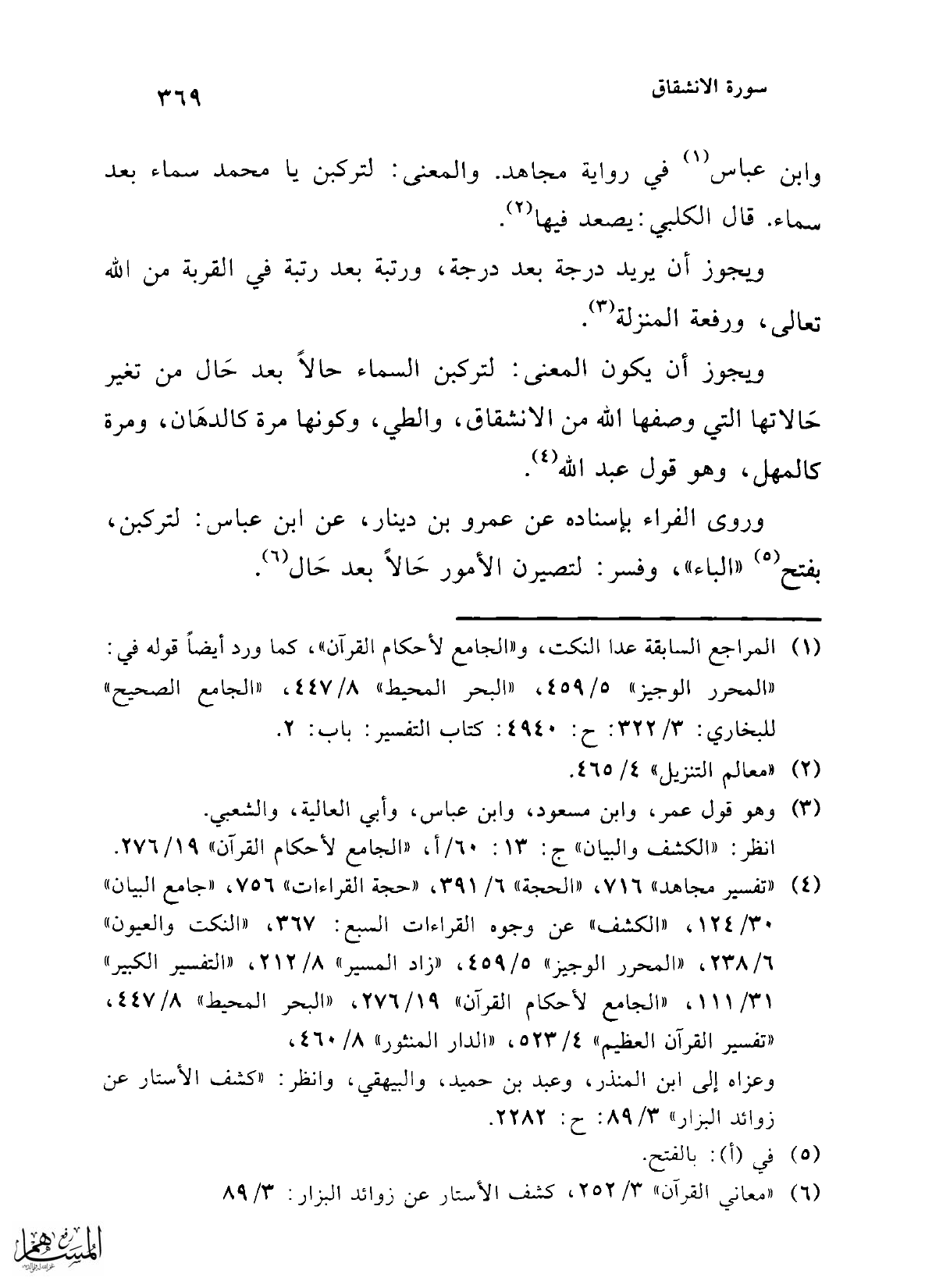(¬4) "تفسير مجاهد" 716، "الحجة" 6/ 391، "حجة القراءات" 756، "جامع البيان" 30/ 124، "الكشف" عن وجوه القراءات السبع: 367، "النكت والعيون" 6/ 238، "المحرر الوجيز" 5/ 459، "زاد المسير" 8/ 212، "التفسير الكبير" 31/ 111، "الجامع لأحكام القرآن" 19/ 276، "البحر المحيط" 8/ 447، "تفسير القرآن العظيم" 4/ 523، "الدار المنثور" 8/ 460،