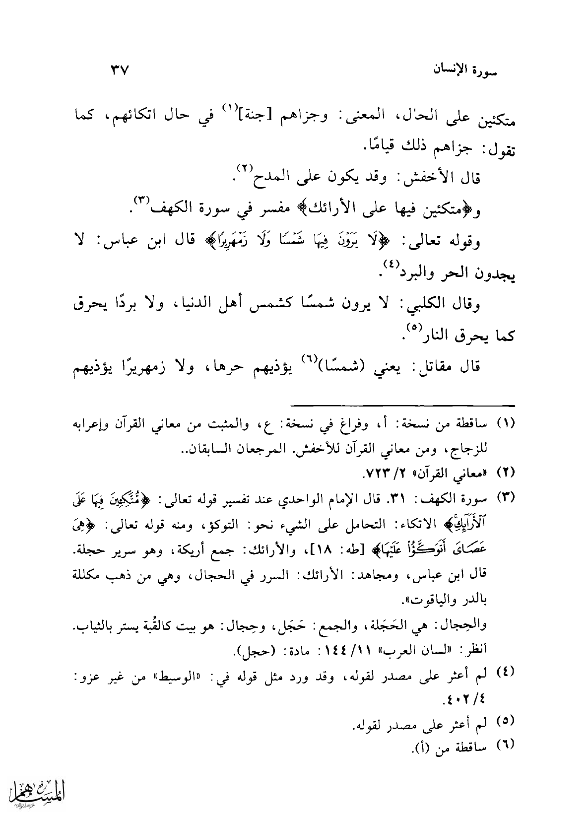 (¬3) سورة الكهف: 31. قال الإمام الواحدي عند تفسير قوله تعالى: {مُتَّكِئِينَ فِيهَا عَلَى الْأَرَائِكِ} الاتكاء: التحامل على الشيء نحو: التوكؤ، ومنه قوله تعالى: {هِيَ عَصَايَ أَتَوَكَّأُ عَلَيْهَا} [طه: 18] والأرائك: جمع أريكة، وهو سرير حجلة قال ابن عباس، ومجاهد: الأرائك: السرر في الحجال، وهي من ذهب مكللة بالدر والياقوت".