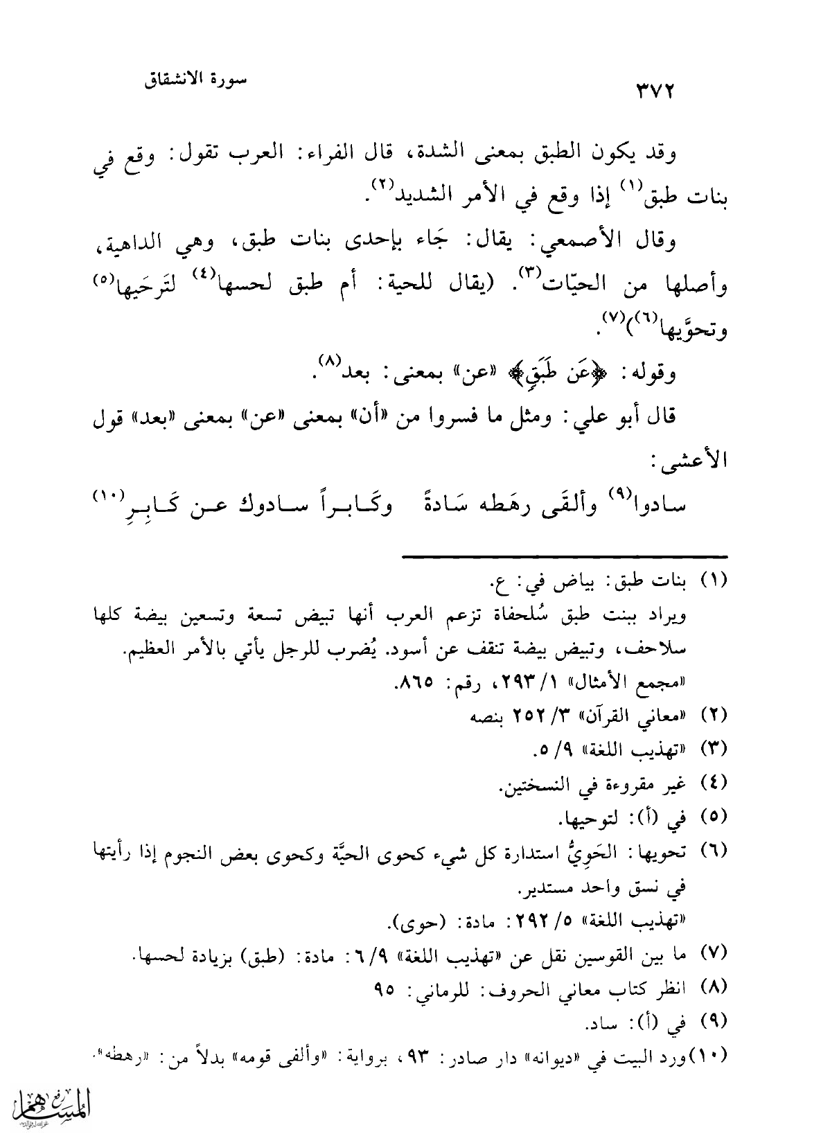 (¬7) ما بين القوسين نقل عن "تهذيب اللغة" 9/ 6: مادة: (طبق) بزيادة لحسها.