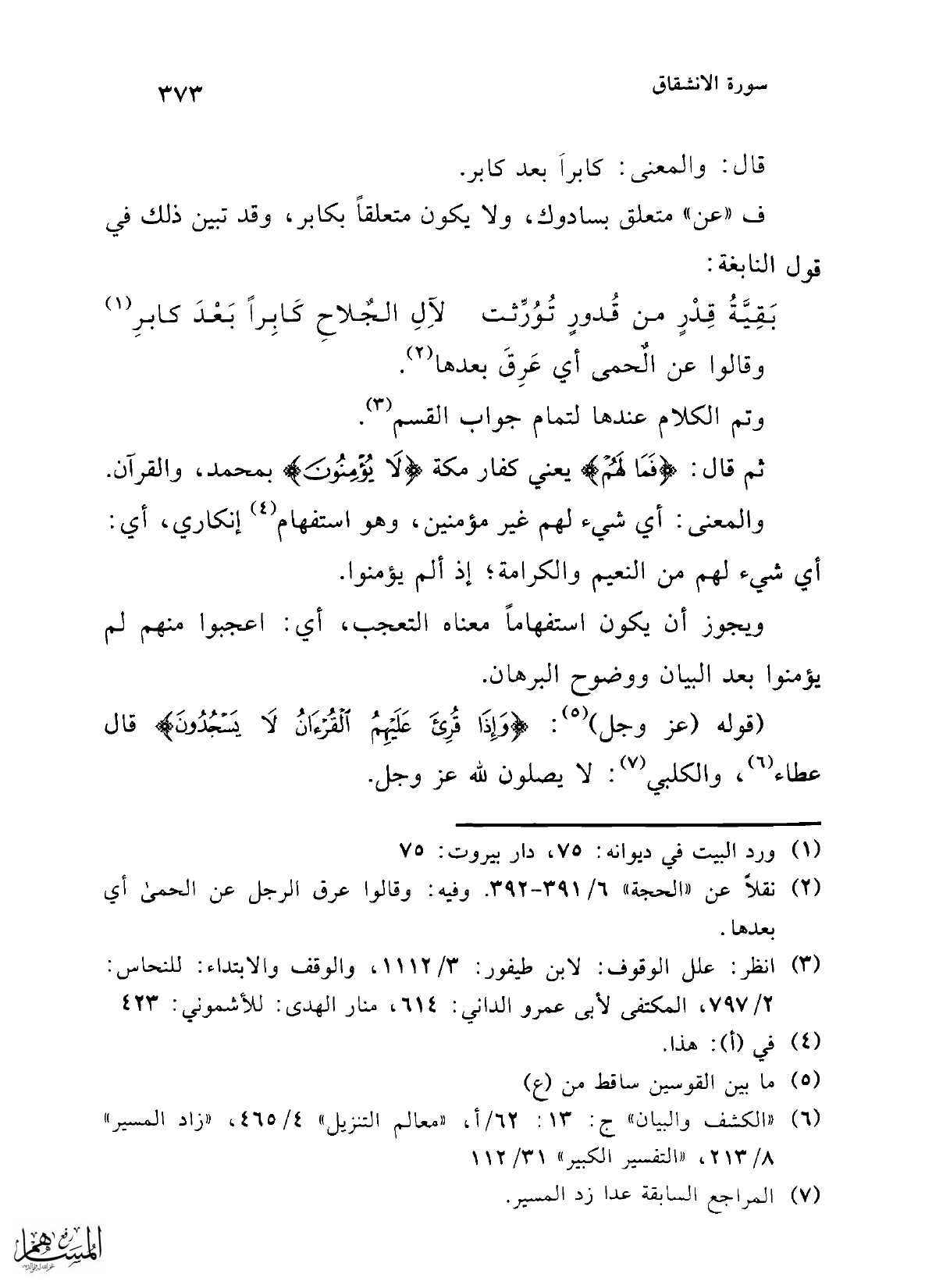 (¬6) " الكشف والبيان" ج: 13: 62/ أ، "معالم التنزيل" 4/ 465، "زاد المسير" 8/ 213، "التفسير الكبير" 31/ 112