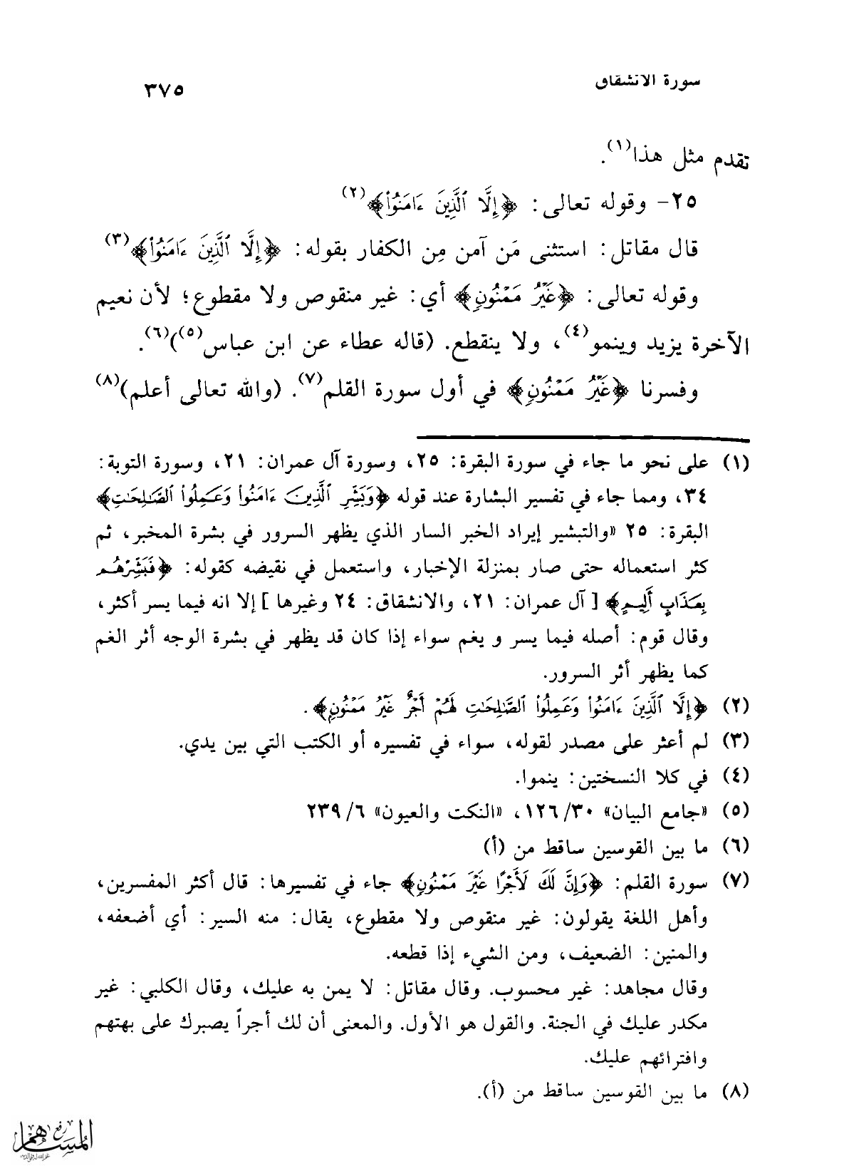 (¬7) سورة القلم: {وَإِنَّ لَكَ لَأَجْرًا غَيْرَ مَمْنُونٍ} جاء في تفسيرها: قال أكثر المفسرين، وأهل اللغة يقولون: غير منقوص ولا مقطوع، يقال: منه السير: أي أضعفه، والمنين: الضعيف، ومن الشيء إذا قطعه.