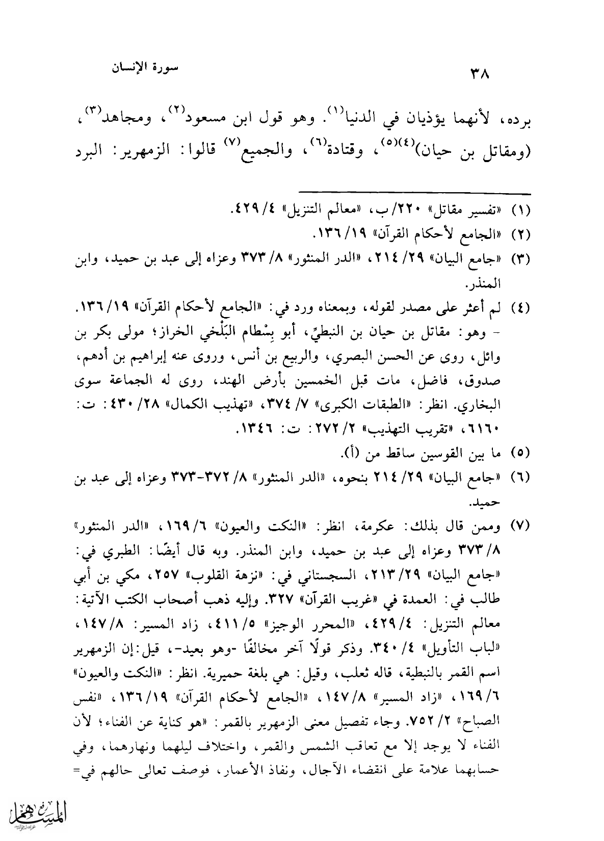 (¬4) لم أعثر على مصدر لقوله، وبمعناه ورد في: "الجامع لأحكام القرآن" 19/ 136. وهو: مقاتل بن حيان بن النبطيِّ، أبو بِسْطام البَلْخي الخراز؛ مولى بكر بن وائل، روى عن الحسن البصري، والربيع بن أنس، وروى عنه إبراهيم بن أدهم، صدوق، فاضل، مات قبل الخمسين بأرض الهند، روى له الجماعة سوى البخاري. انظر: "الطبقات الكبرى" 7/ 374، "تهذيب الكمال" 28/ 430: ت: 6160، "تقريب التهذيب" 2/ 272: ت: 1346.