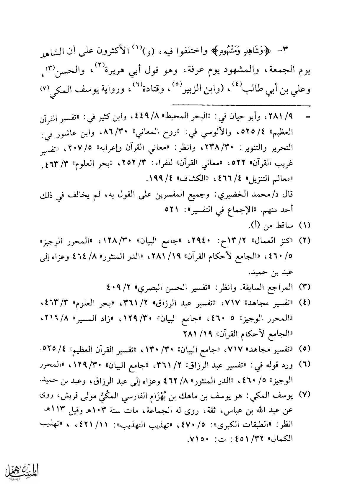 3 - {وَشَاهِدٍ وَمَشْهُودٍ} واختلفوا فيه، (و) (¬1) الأكثرون على أن الشاهد يوم الجمعة، والمشهود يوم عرفة، وهو قول أبي هريرة (¬2)، والحسن (¬3) , وعلي بن أبي طالب (¬4)، (وابن الزبير (¬5)، وقتادة (¬6)، ورواية يوسف المكي (¬7)