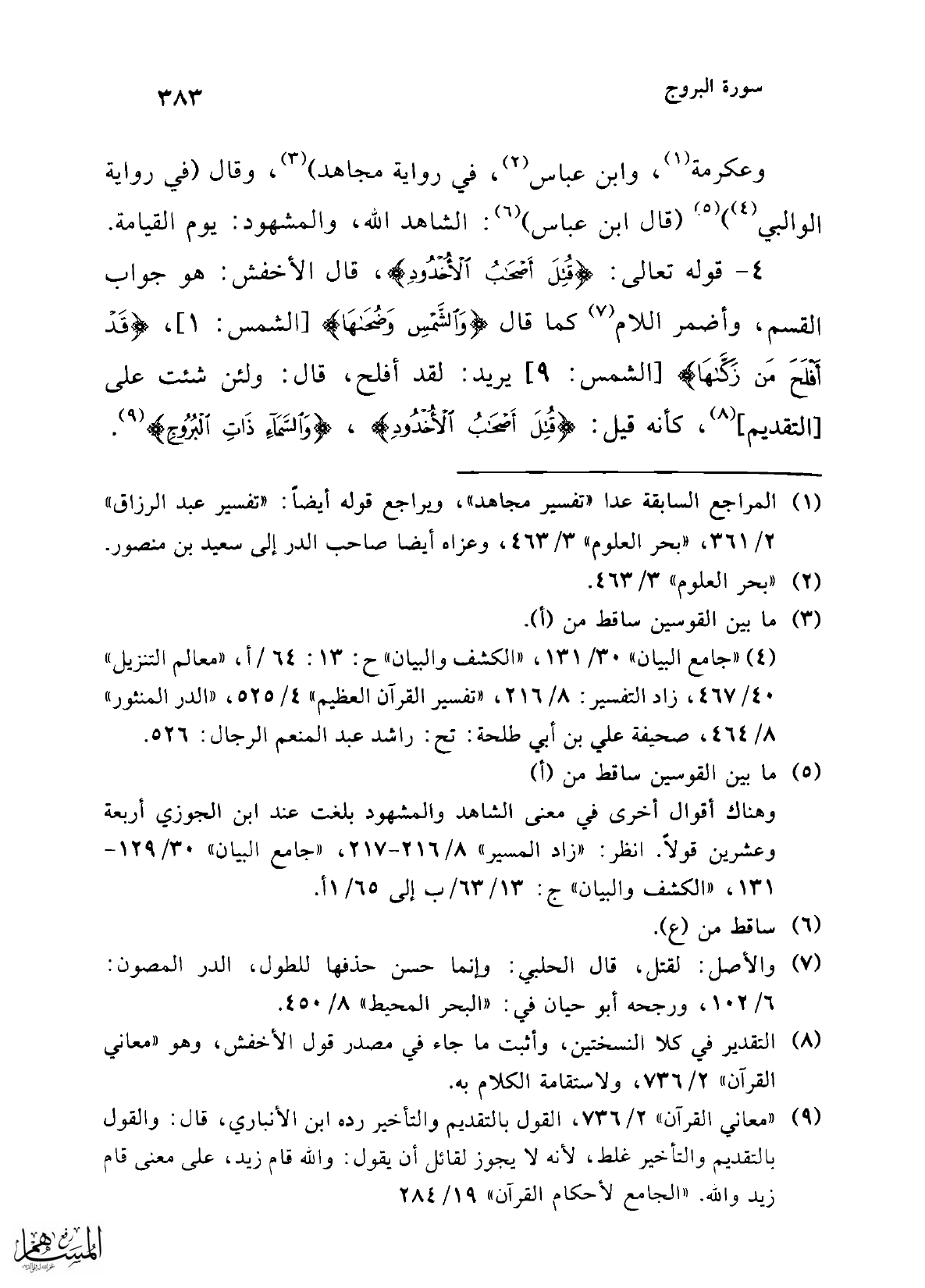 وهناك أقوال أخرى في معنى الشاهد والمشهود بلغت عند ابن الجوزي أربعة وعشرين قولاً. انظر: "زاد المسير" 8/ 216 - 217، "جامع البيان" 30/ 129 - 131، "الكشف والبيان" ج: 13/ 63/ ب إلى 65/ 1 أ.