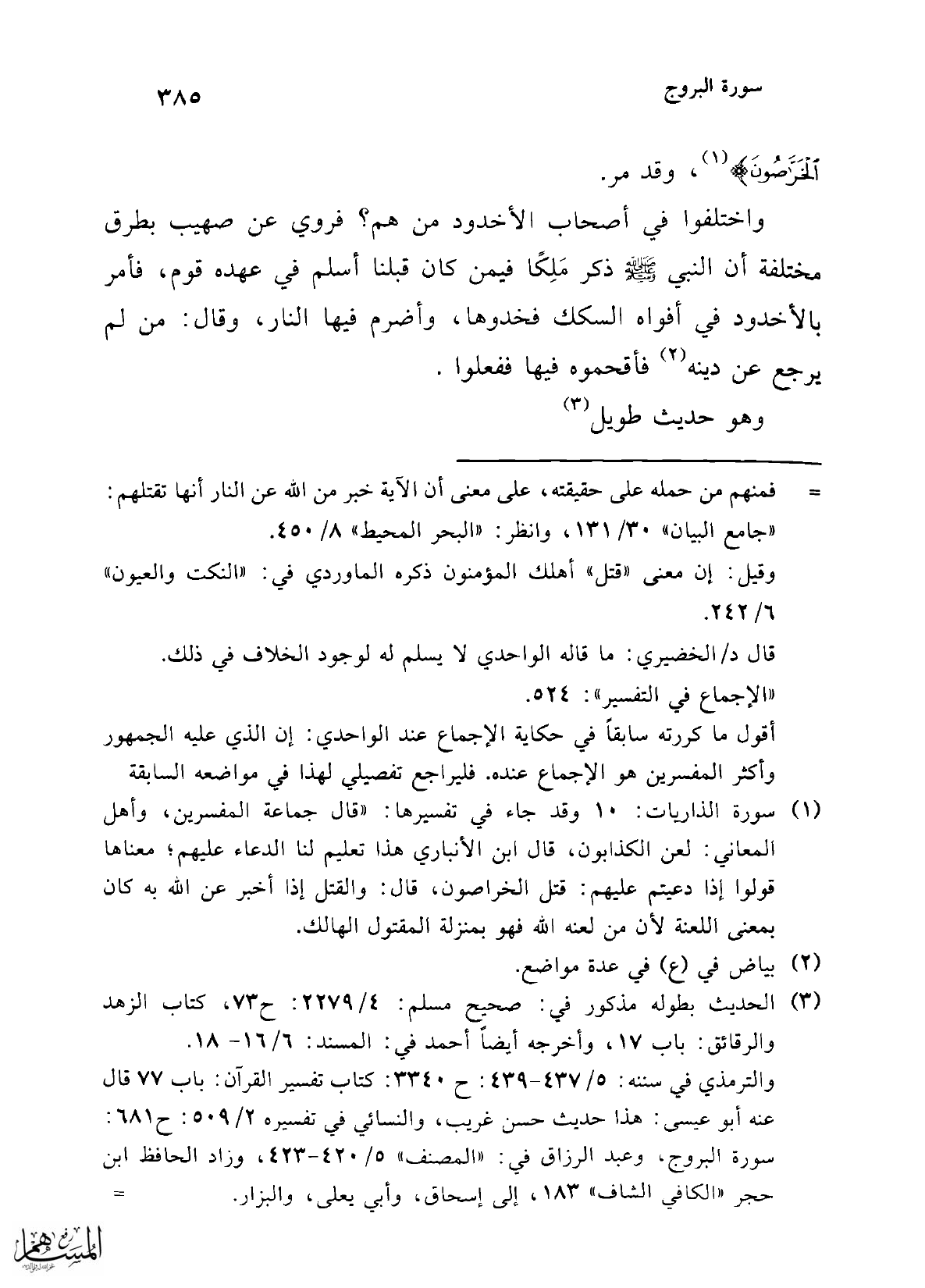 واختلفوا في أصحاب الأخدود من هم؟ فروي عن صهيب بطرق مختلفة أن النبي -صلى الله عليه وسلم- ذكر مَلِكًا فيمن كان قبلنا أسلم في عهده قوم، فأمر بالأخدود في أفواه السكك فخدوها، وأضرم فيها النار، وقال: من لم يرجع عن دينه (¬2) فأقحموه فيها ففعلوا.