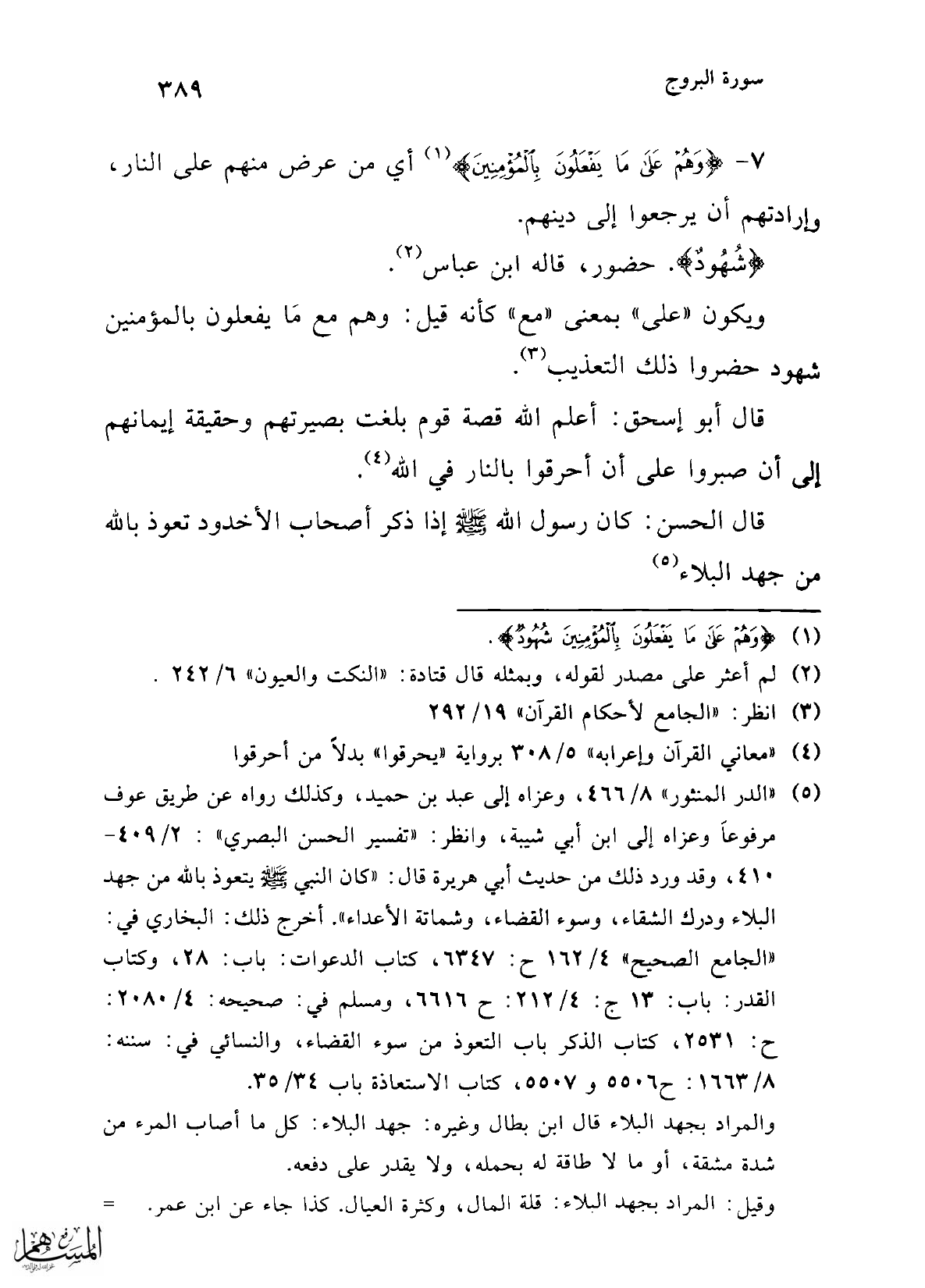 7 - {وَهُمْ عَلَى مَا يَفْعَلُونَ بِالْمُؤْمِنِينَ} (¬1) أي من عرض منهم على النار، وإرادتهم أن يرجعوا إلى دينهم.