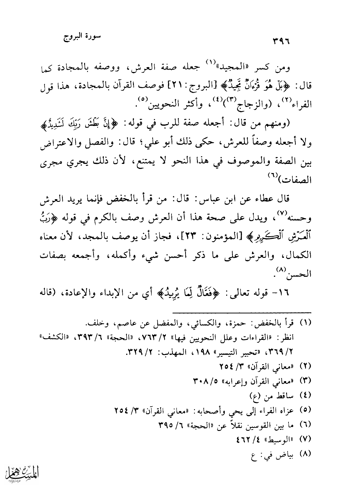 قال عطاء عن ابن عباس: قال: من قرأ بالخفض فإنما يريد العرش وحسنه (¬7)، ويدل على صحة هذا أن العرش وصف بالكرم في قوله {رَبُّ الْعَرْشِ الْكَرِيمِ} [المؤمنون: 23]، فجاز أن يوصف بالمجد، لأن معناه الكمال، والعرش على ما ذكر أحسن شيء وأكمله، وأجمعه بصفات الحسن (¬8).