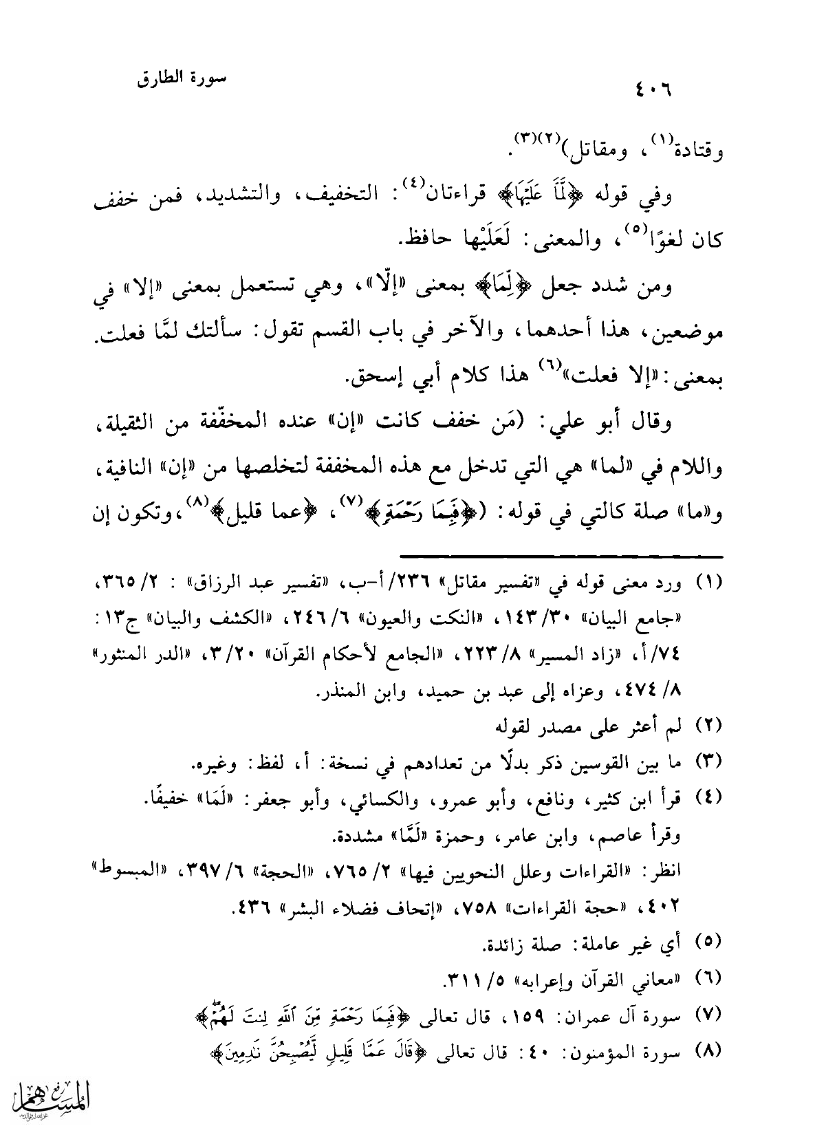 وفي قوله {لَمَّا عَلَيْهَا} (¬4): التخفيف، والتشديد، فمن خلف كان لغوًا (¬5)، والمعنى: لَعَلَيْها حافظ.