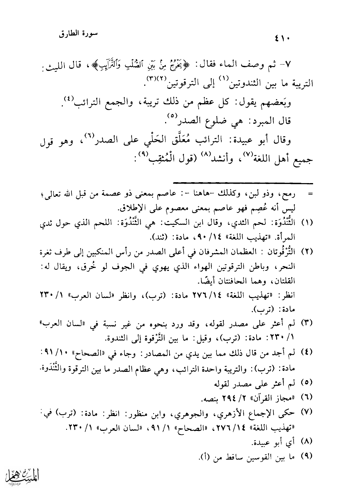 7 - ثم وصف الماء فقال: {يَخْرُجُ مِنْ بَيْنِ الصُّلْبِ وَالتَّرَائِبِ}، قال الليث: التريبة ما بين الثندوتين (¬1) إلى الترقوتين (¬2) (¬3).