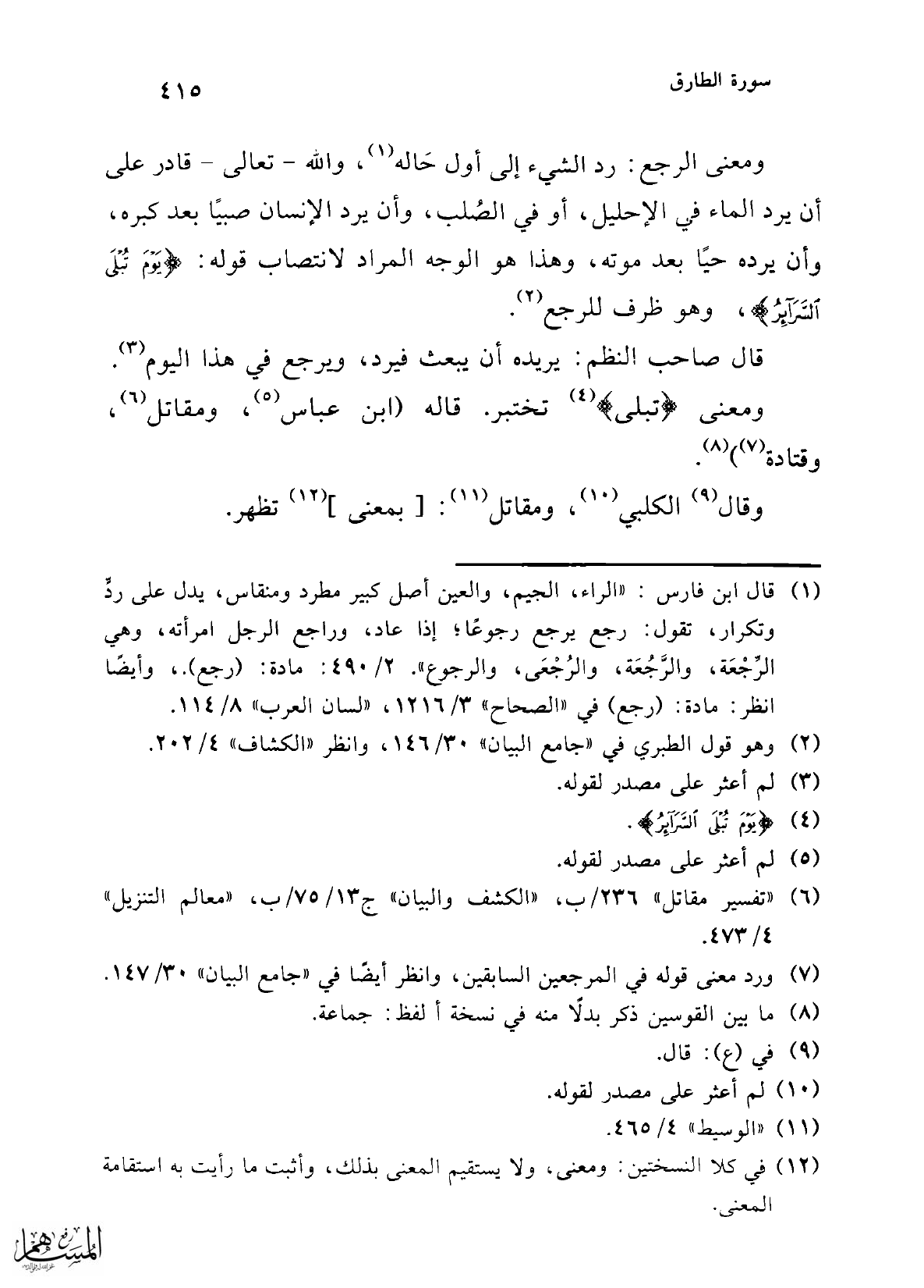 ومعنى الرجع: رد الشيء إلى أول حَاله (¬1)، والله -تعالى- قادر على أن يرد الماء في الإحليل، أو في الصُلب، وأن يرد الإنسان صبيًا بعد كبره، وأن يرده حيًا بعد موته، وهذا هو الوجه المراد لانتصاب قوله: {يَوْمَ تُبْلَى السَّرَائِرُ}، وهو ظرف للرجع (¬2).