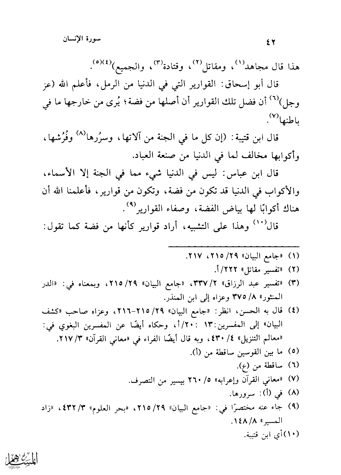 قال ابن عباس: ليس في الدنيا شيء مما في الجنة إلا الأسماء، والأكواب في الدنيا قد تكون من فضة، وتكون من قوارير، فأعلمنا الله أن هناك أكوابًا لها بياض الفضة، وصفاء القوارير (¬9).
