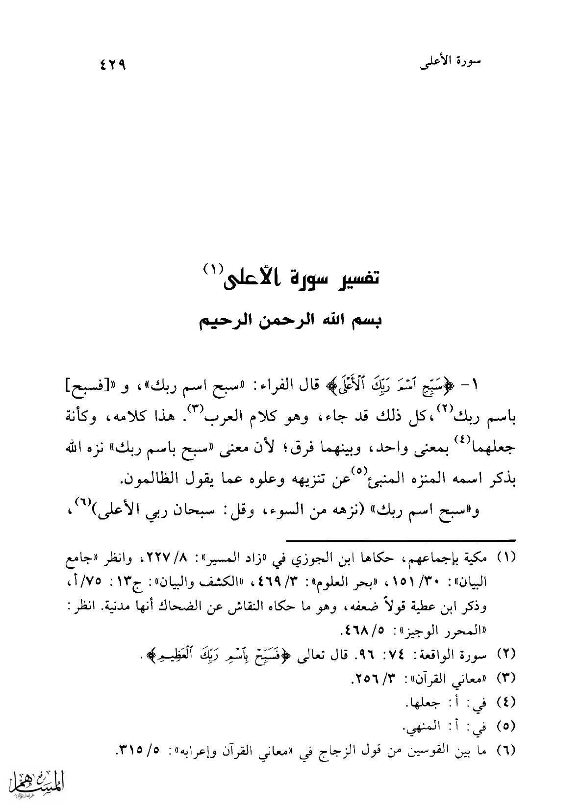 و"سبح اسم ربك" (نزهه من السوء، وقيل: سبحان ربي الأعلى) (¬6)،