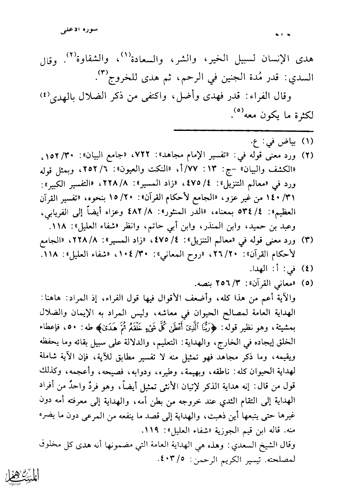 والآية أعم من هذا كله، وأضعف الأقوال فيها قول الفراء، إذ المراد: هاهنا: الهداية العامة لمصالح الحيوان في معاشه، وليس المراد به الإيمان والضلال بمشيئة، وهو نظير قوله: {رَبُّنَا الَّذِي أَعْطَى كُلَّ شَيْءٍ خَلْقَهُ ثُمَّ هَدَى} طه: 50، فإعطاء الخلق إيجاده في الخارج، والهداية: التعليم، والدلالة على سبيل بقائه وما يحفظه ويقيمه، وما ذكر مجاهد فهو تمثيل منه لا تفسير مطابق للآية، فإن الآية شاملة لهداية الحيوان كله: ناطقه، وبهيمة، وطيره، ودوابه، فصيحه، وأعجمه، وكذلك قول من قال: إنه هداية الذكر لإتيان الأنثى تمثيل أيضًا، وهو فردٌ واحدٌ من أفراد الهداية إلى التقام الثدي عند خروجه من بطن أمه، والهداية إلى معرفته أمه دون غيرها حتى يتبعها أين ذهبت، والهداية إلى قصد ما ينفعه من المرعى دون ما يضره منه. قاله ابن قيم الجوزية "شفاء العليل": 119.