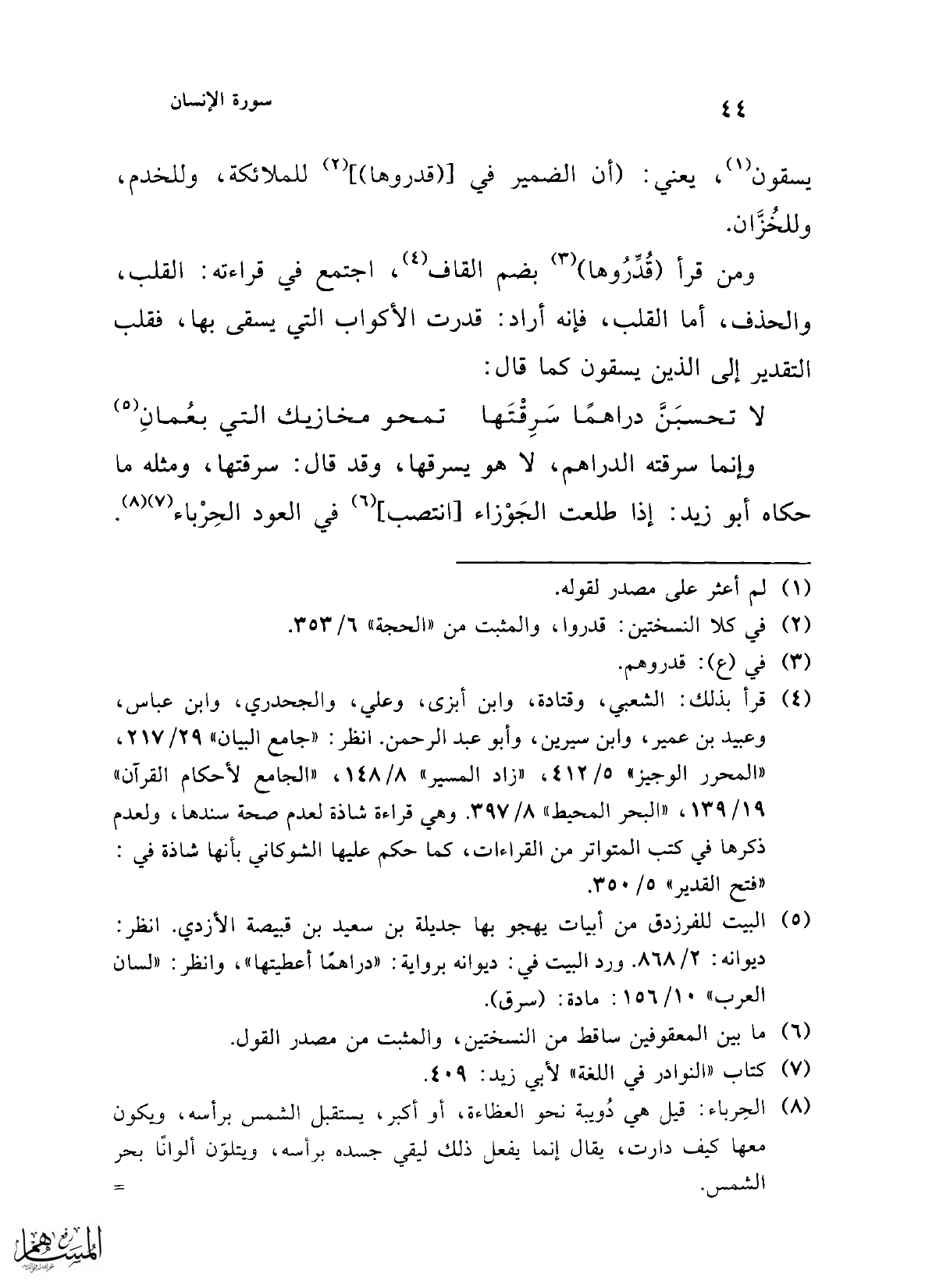 (¬4) قرأ بذلك: الشعبي، وقتادة، وابن أبزى، وعلي، والجحدري، وابن عباس، وعبيد بن عمير، وابن سيرين، وأبو عبد الرحمن. انظر: "جامع البيان" 29/ 217، "المحرر الوجيز" 5/ 412، "زاد المسير" 8/ 148، "الجامع لأحكام القرآن" 19/ 139، "البحر المحيط" 8/ 397. وهي قراءة شاذة لعدم صحة سندها؛ ولعدم ذكرها في كتب المتواتر من القراءات، كما حكم عليها الشوكاني بأنها شاذة في: "فتح القدير" 5/ 350.