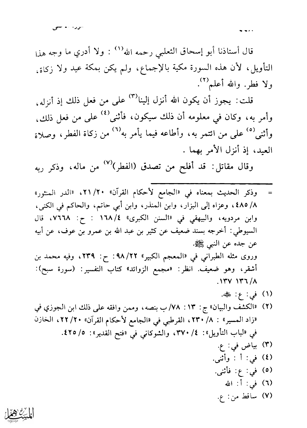 قال أستاذنا أبو إسحاق الثعلبي رحمه الله (¬1): ولا أدري ما وجه هذا التأويل، لأن هذه السورة مكية بالإجماع، ولم يكن بمكة عيد ولا زكاة، ولا فطر. والله أعلم (¬2).