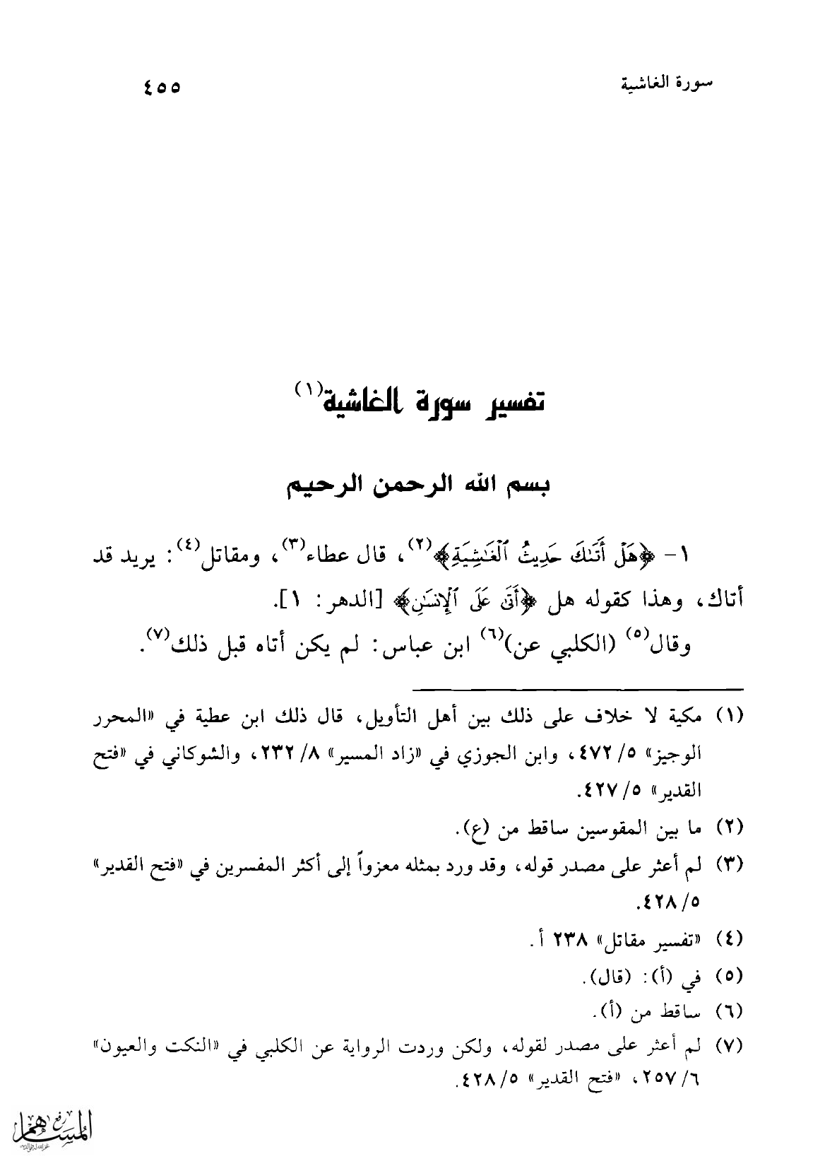 1 - {هَلْ أَتَاكَ حَدِيثُ الْغَاشِيَةِ} (¬2)، قال عطاء (¬3)، ومقاتل (¬4): يريد قد أتاك، وهذا كقوله هل {هَلْ أَتَى عَلَى الْإِنْسَانِ} [الدهر: 1].