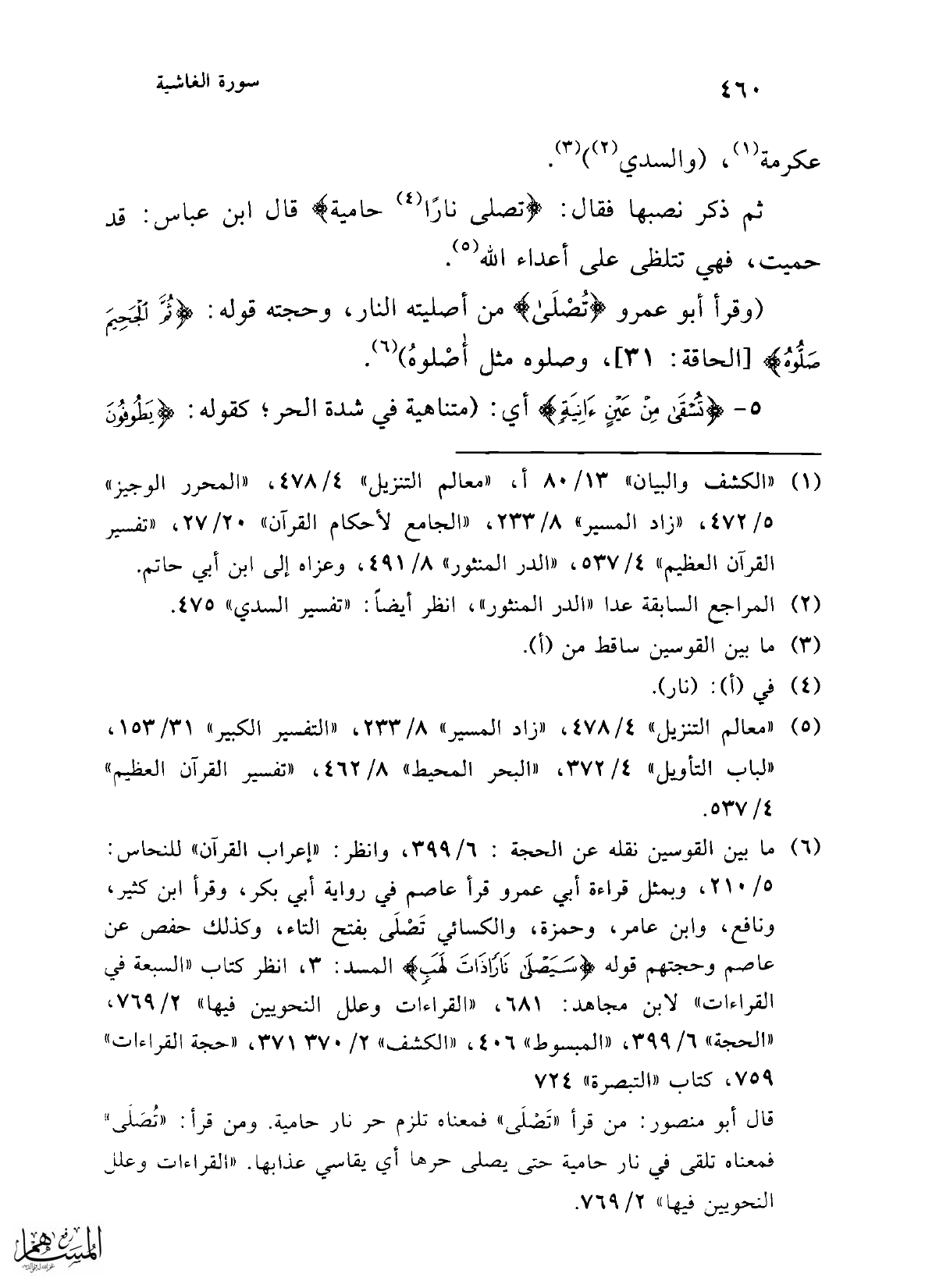 (¬5) "معالم التنزيل" 4/ 478، "زاد المسير" 8/ 233، "التفسير الكبير" 31/ 153، "لباب التأويل" 4/ 372، "البحر المحيط" 8/ 462، "تفسير القرآن العظيم" 4/ 537.