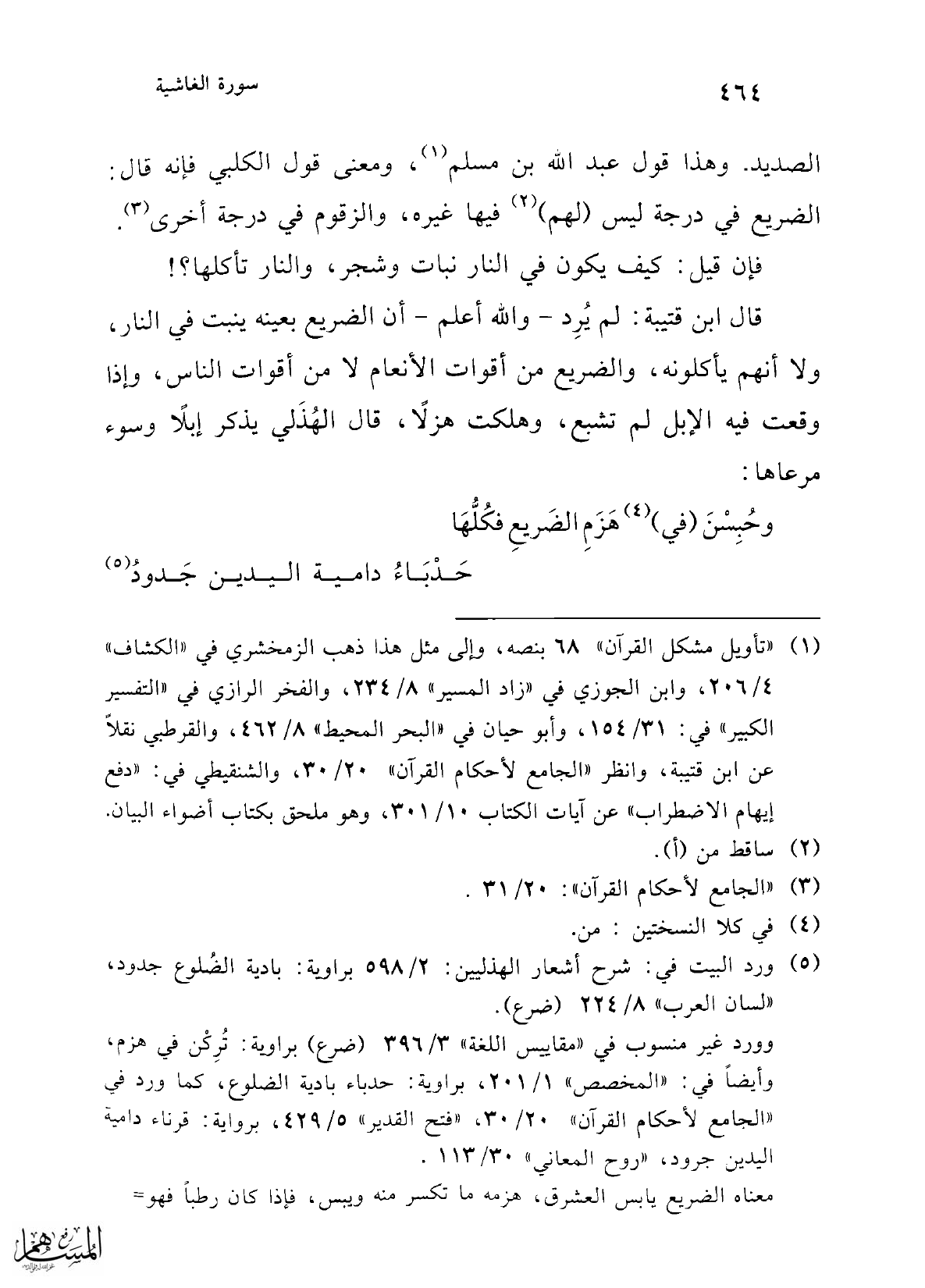 قال ابن قتيبة: لم يُرِد -والله أعلم- أن الضريع بعينه ينبت في النار، ولا أنهم يأكلونه، والضريح من أقوات الأنعام لا من أقوات الناس، وإذا وقعت فيه الإبل لم تشبع، وهلكت هزلاً، قال الهُذَلي يذكر إبلًا وسوء مرعاها: