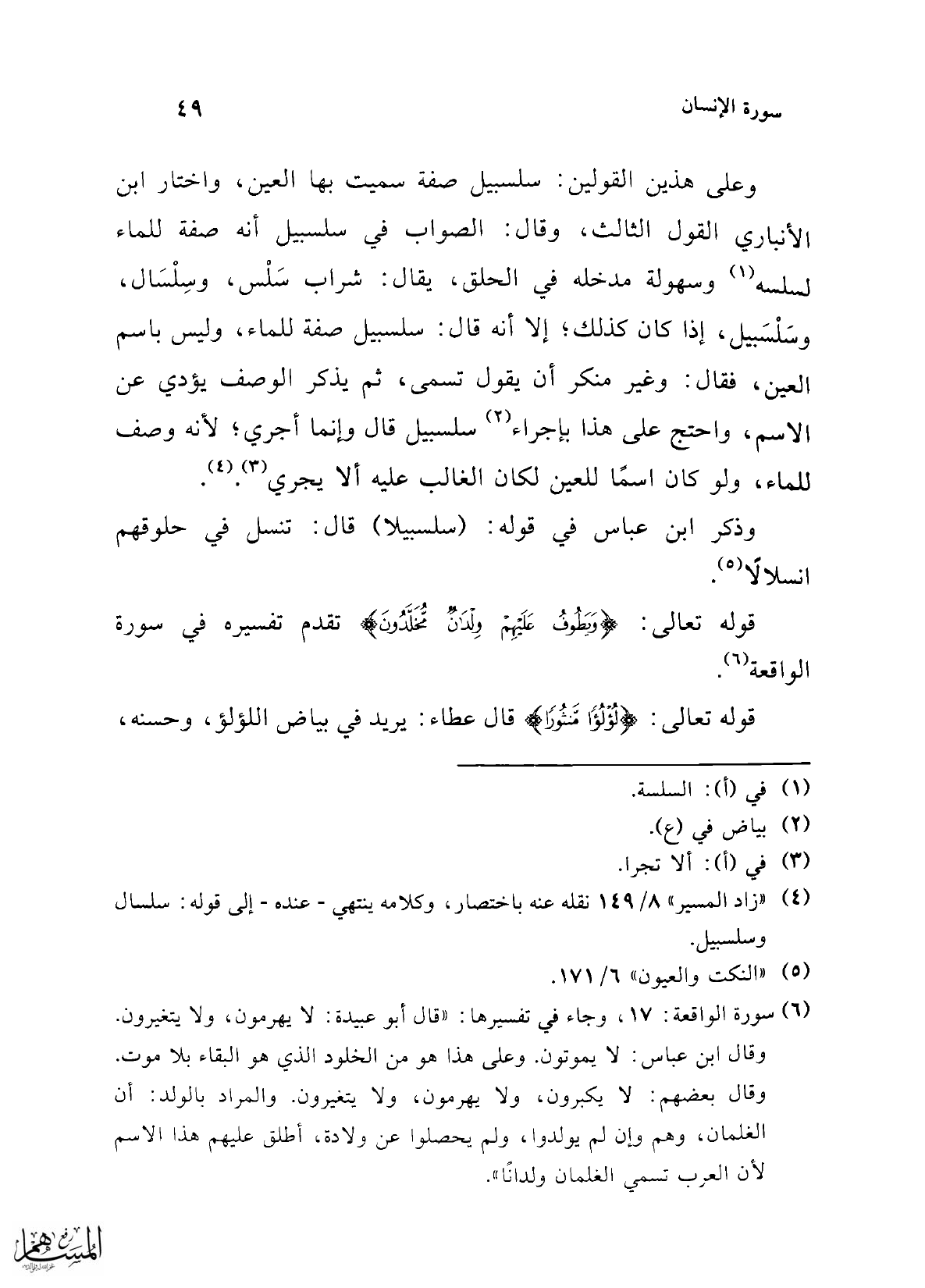 (¬4) "زاد المسير" 8/ 149 نقله عنه باختصار، وكلامه ينتهي -عنده- إلى قوله: سلسال وسلسبيل.