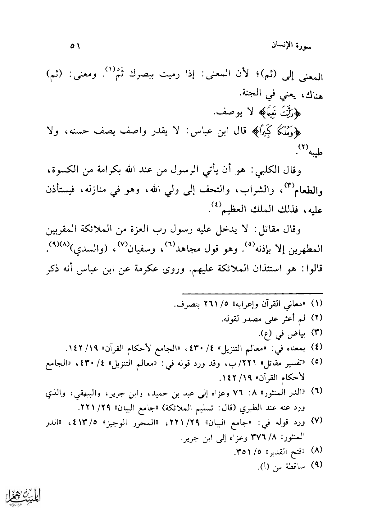 (¬6) "الدر المنثور" 8: 76 وعزاه إلى عبد بن حميد، وابن جرير، والبيهقي، والذي ورد عنه عند الطبري (قال: تسليم الملائكة) "جامع البيان" 29/ 221.