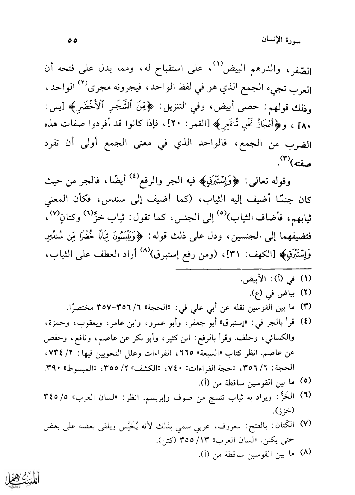 (¬4) قرأ بالجر في: "إستبرق" أبو جعفر، وأبو عمرو، وابن عامر، ويعقوب، وحمزة، والكسائي، وخلف. وقرأ بالرفع: ابن كثير، وأبو بكر عن عاصم، ونافع، وحفص عن عاصم. انظر كتاب "السبعة" 665، القراءات وعلل النحويين فيها: 2/ 734، الحجة: 6/ 356، "حجة القراءات" 740، "الكشف" 2/ 355، "المبسوط" 390.
