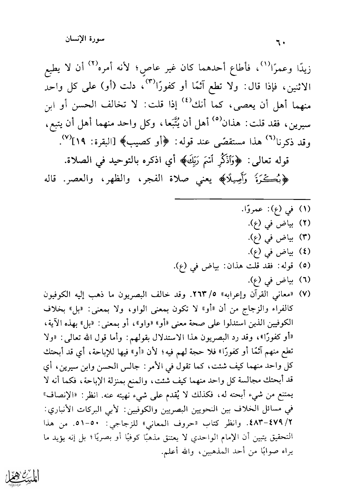 زيدًا وعمرًا (¬1)، فأطاع أحدهما كان غير عاصٍ؛ لأنه أمره (¬2) أن لا يطيع الاثنين، فإذا قال: ولا تطع آثمًا أو كفورًا (¬3)، دلت (أو) على كل واحد منهما أهل أن يعصى، كما أنك (¬4) إذا قلت: لا تخالف الحسن أو ابن سيرين، فقد قلت: هذان (¬5) أهل أن يُتَّبَعا، وكل واحد منهما أهل أن يتبع، وقد ذكرنا (¬6) هذا مستقصى عند قوله: {أَوْ كَصَيِّبٍ} [البقرة: 19] (¬7).