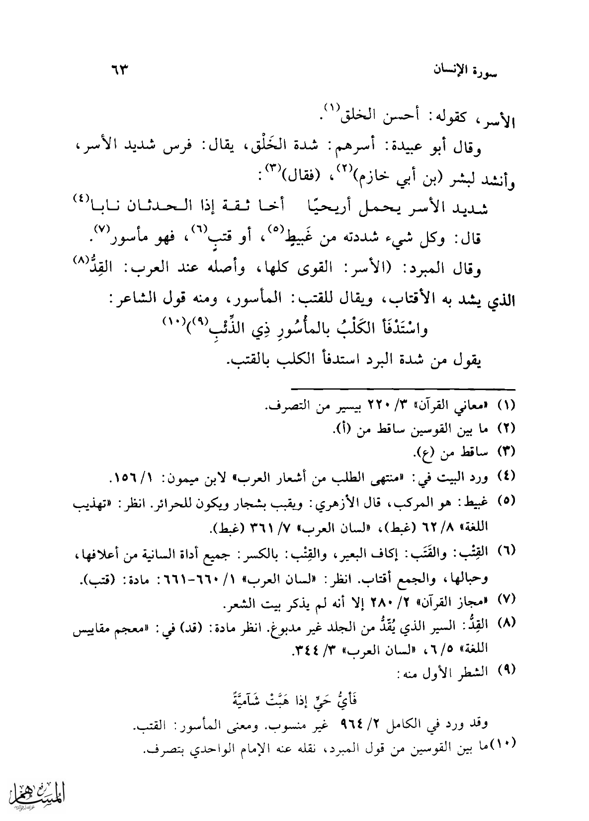 وقال المبرد: (الأسر: القوى كلها، وأصله عند العرب: القِدُّ (¬8) الذي يشد به الأقتاب، ويقال للقتب: المأسور، ومنه قول الشاعر:
