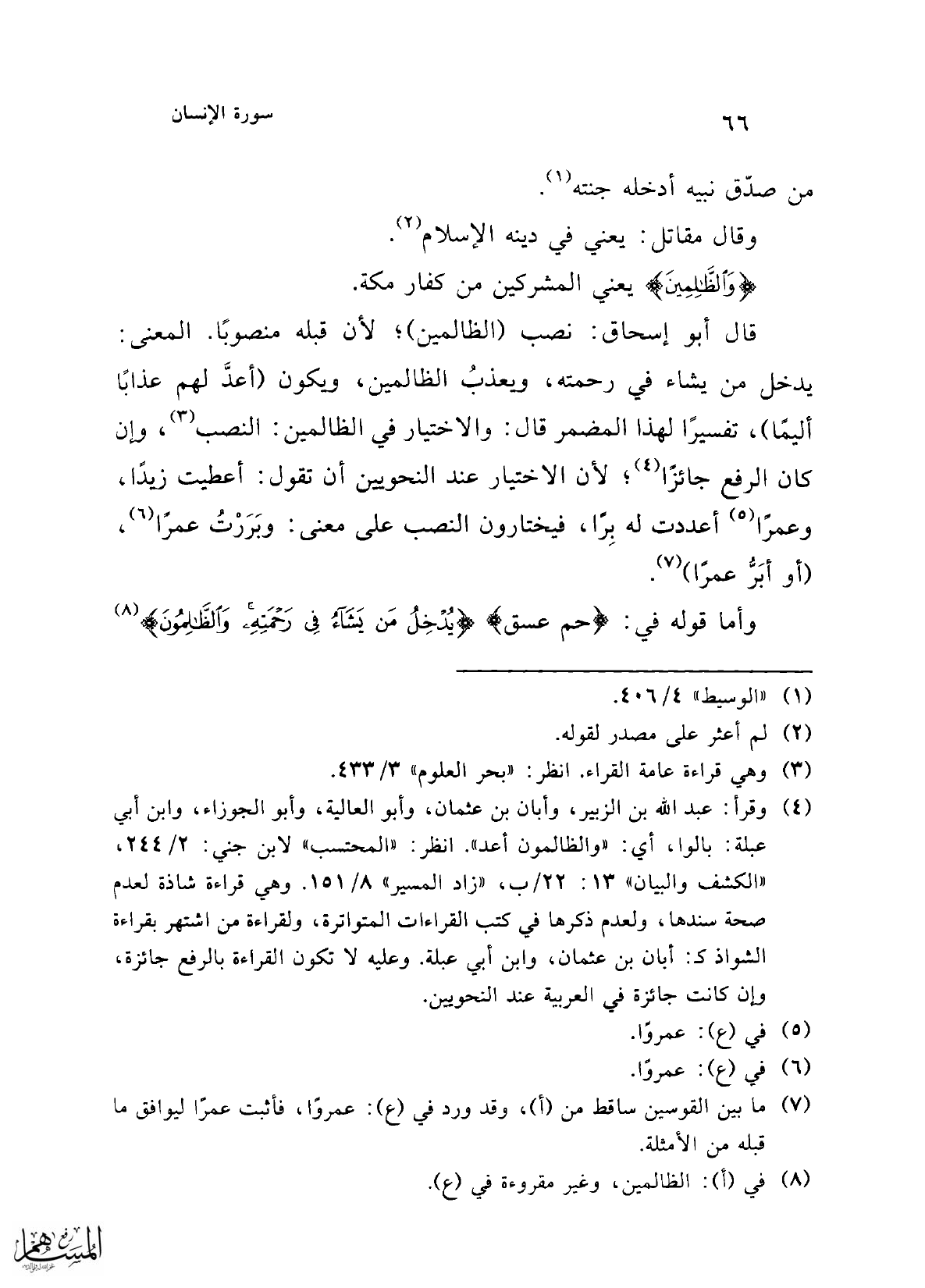 قال أبو إسحاق: نصب (الظالمين)؛ لأن قبله منصوبًا. المعنى: يدخل من يشاء في رحمته، ويعذبُ الظالمين، ويكون (أعدَّ لهم عذابًا أليمًا)، تفسيرًا لهذا المضمر قال: والاختيار في الظالمين: النصب (¬3)، وإن كان الرفع جائزًا (¬4)؛ لأن الاختيار عند النحويين أن تقول: أعطيت زيدًا، وعمرًا (¬5) أعددت له بِرًا، فيختارون النصب على معنى: وبَرَرْتُ عمرًا (¬6)، (أو أبَرُّ عمرًا) (¬7).