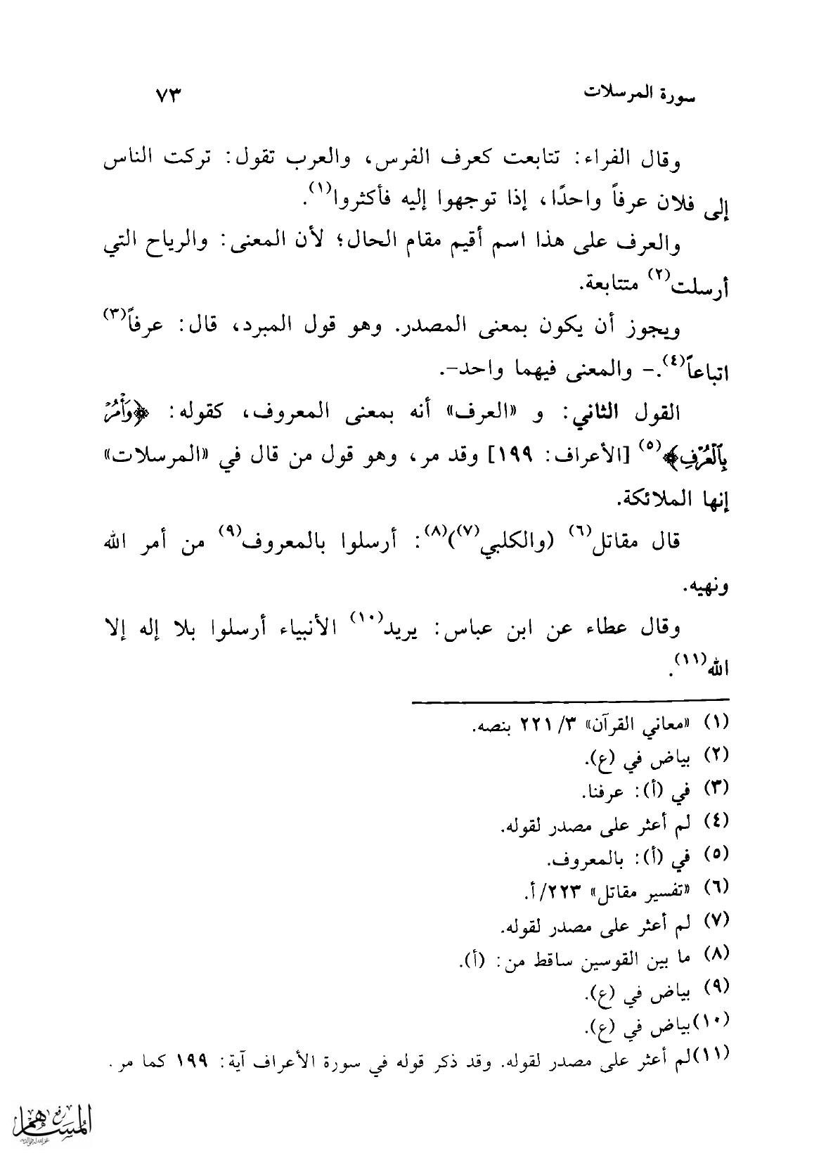 القول الثاني: و"العرف" أنه بمعنى المعروف، كقوله: {وَأْمُرْ بِالْعُرْفِ} (¬5) [الأعراف: 199] وقد مر، وهو قول من قال في "المرسلات " إنها الملائكة.
