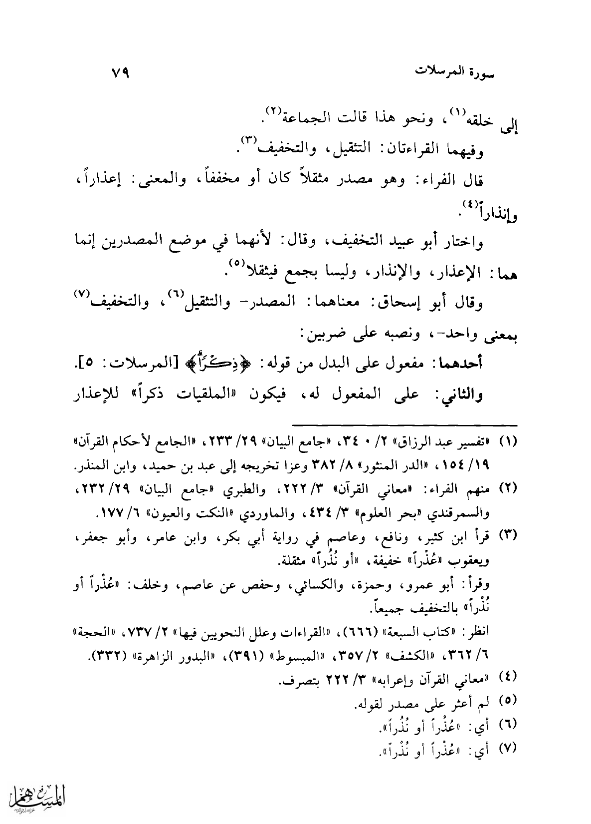 (¬3) قرأ ابن كثير، ونافع، وعاصم في رواية أبي بكر، وابن عامر، وأبو جعفر، ويعقوب "عُذْراً" خفيفة، "أو نُذُراً" مثقلة.