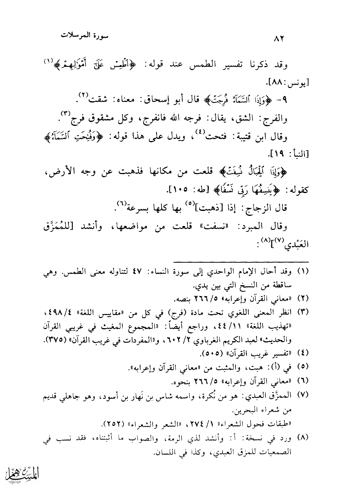 9 - {وَإِذَا السَّمَاءُ فُرِجَتْ} قال أبو إسحاق: معناه: شقت (¬2).