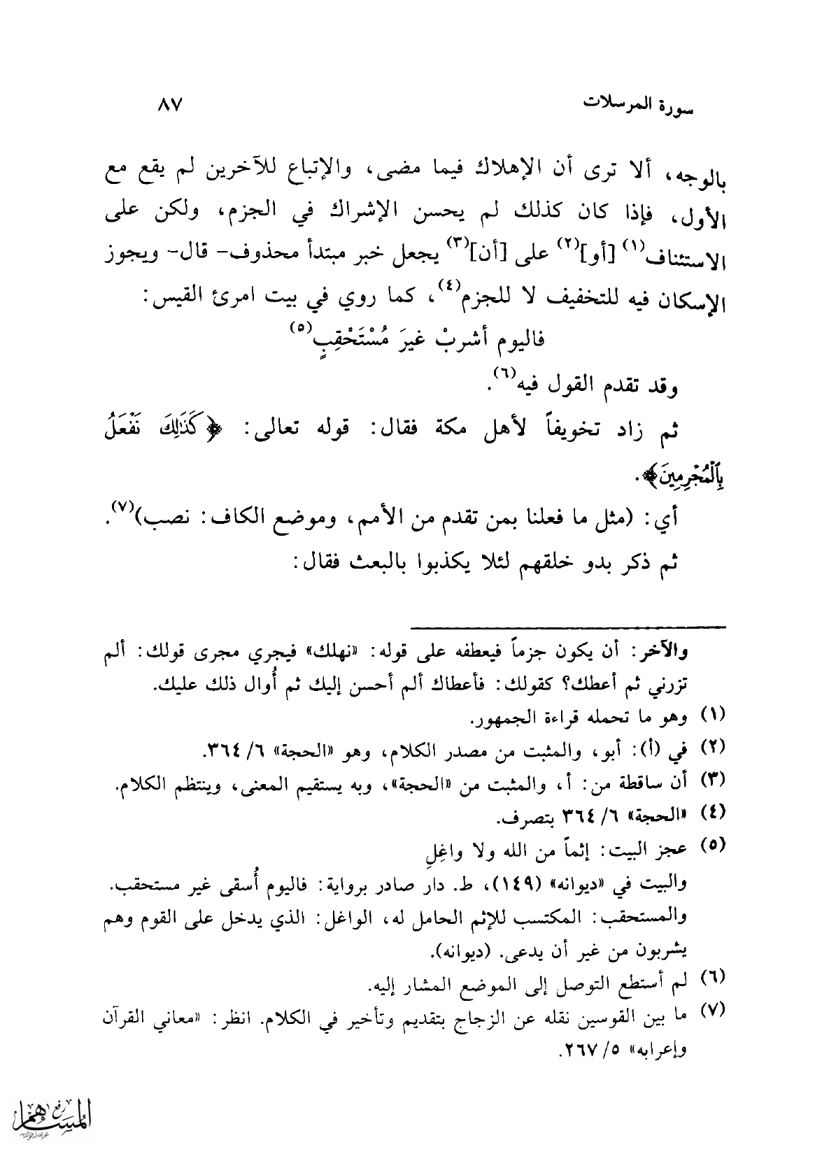 = والأخر: أن يكون جزماً فيعطفه على قوله: "نهلك" فيجري مجرى قولك: ألم تزرني ثم أعطك؟ كقولك: فأعطاك ألم أحسن إليك ثم أُوال ذلك عليك.